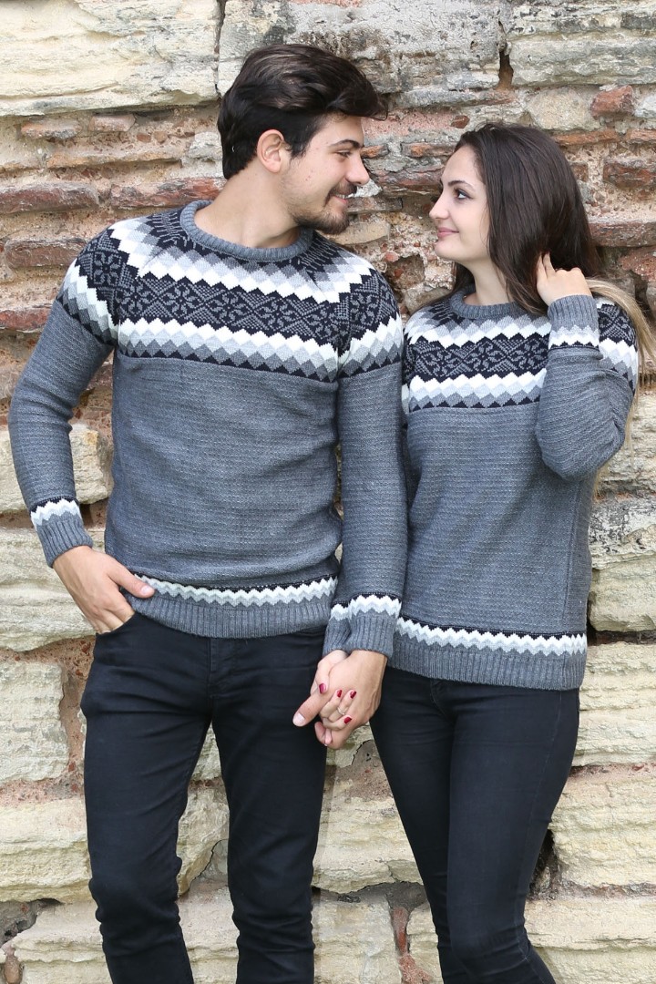 Baklava Desenli Gri Kalın Kışlık Günlük Triko Kazak
