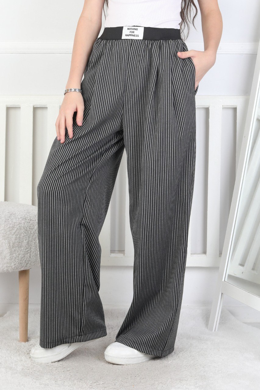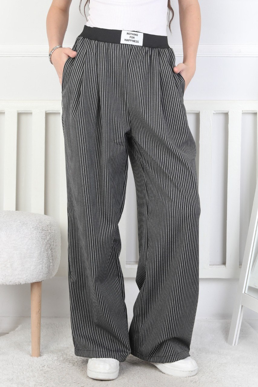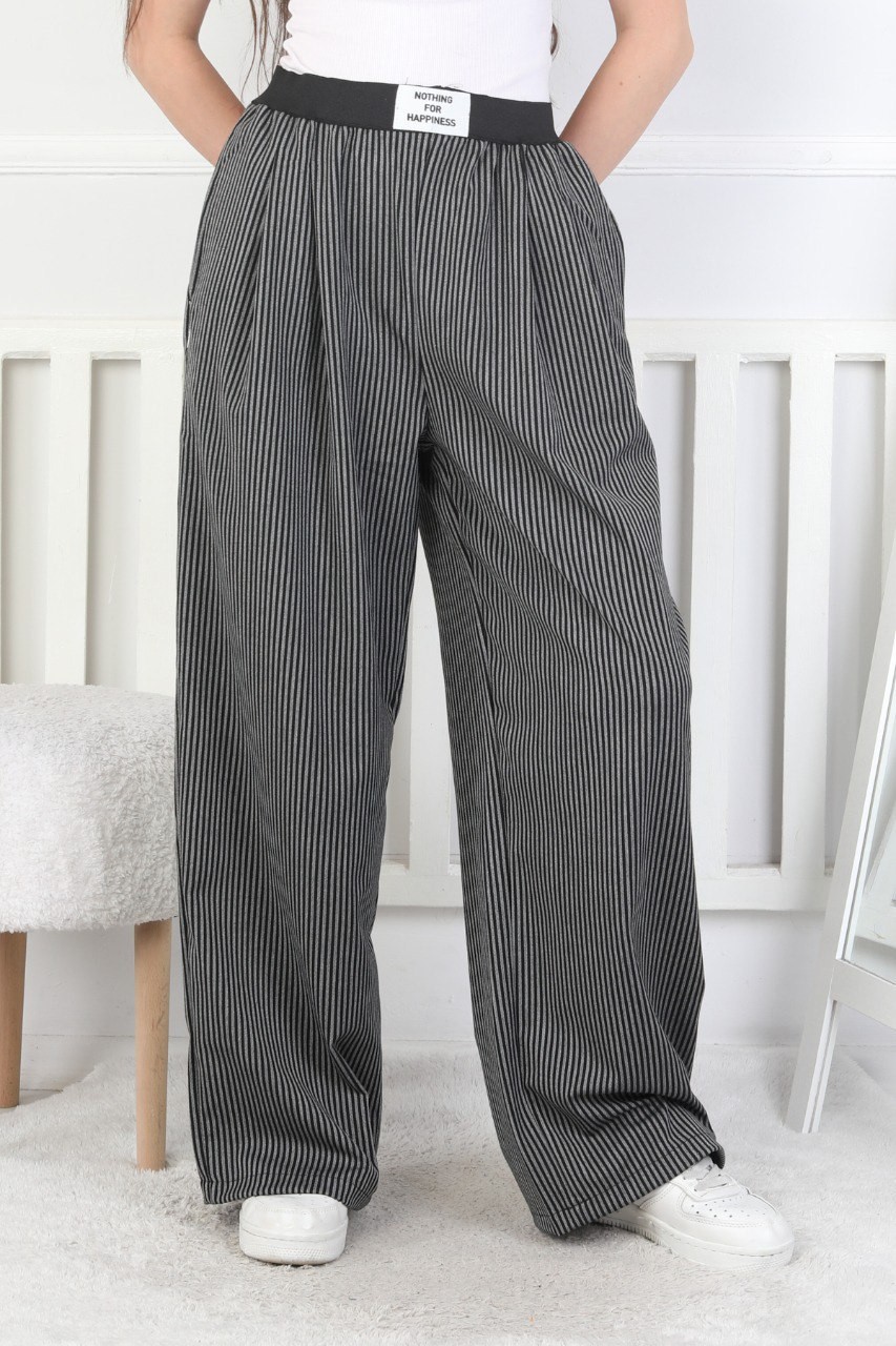 Bol Paça Dik Çizgili Kız Çocuk Siyah Eşofman Altı