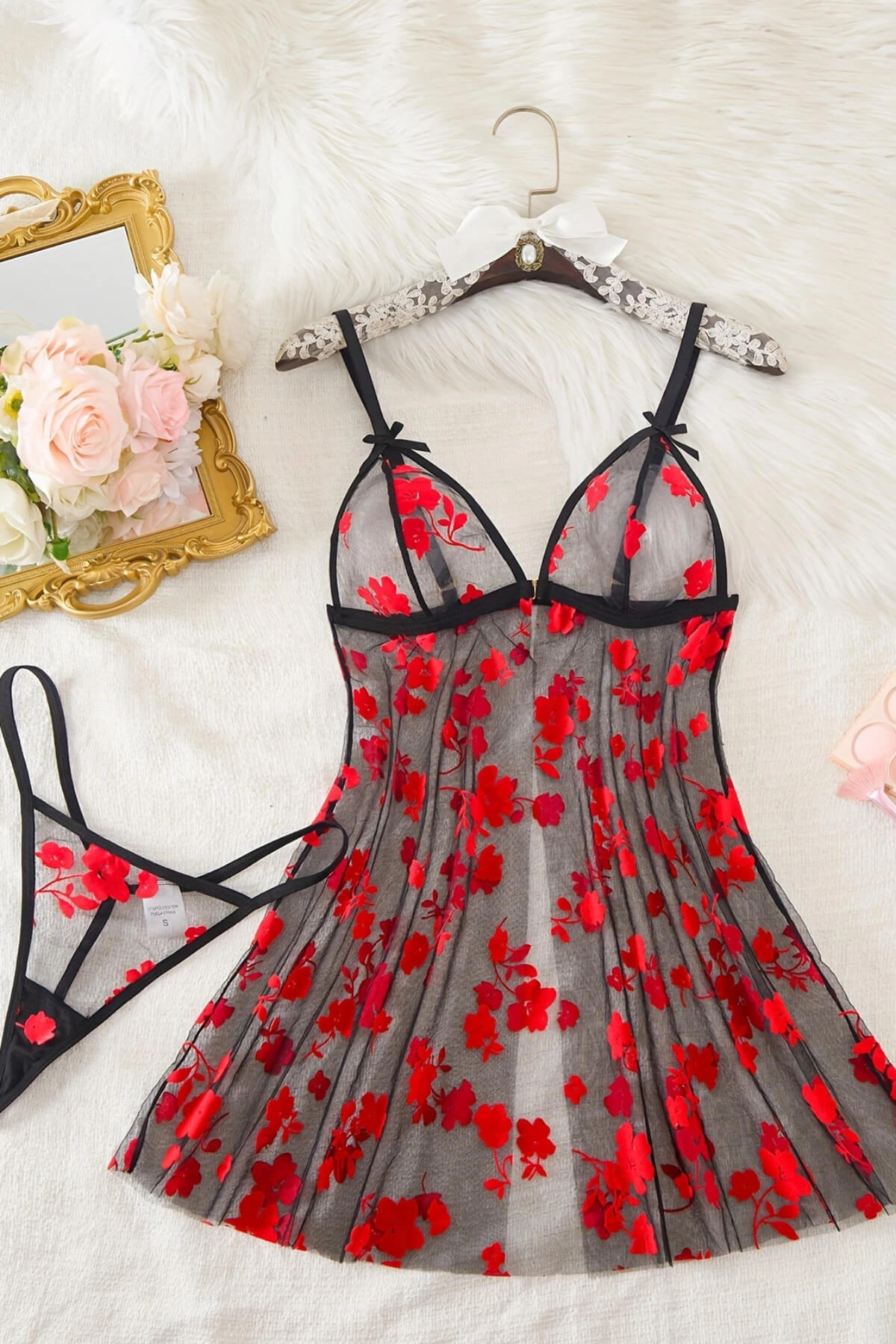 Çiçek Desenli Siyah Transparan Gecelik TM1319