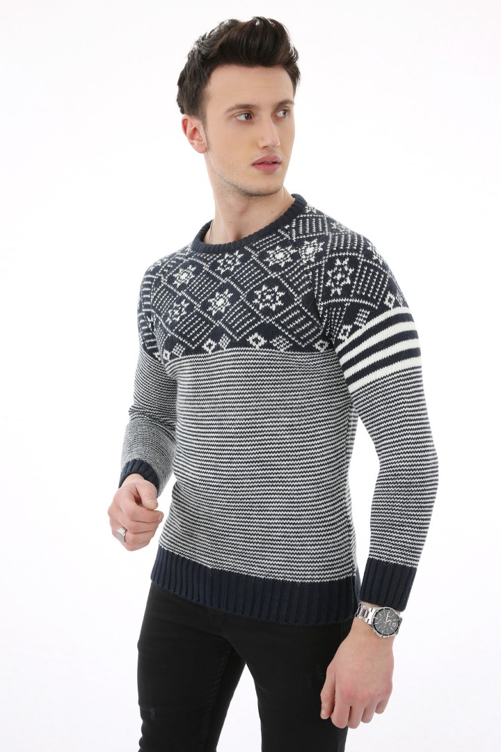 Çizgili Desenli Kalın Kışlık Erkek Günlük Triko Kazak