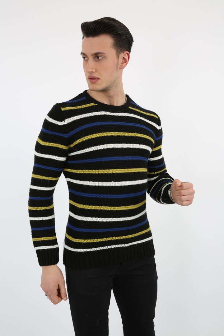 Çok Renkli Çizgi Desenli Siyah Kalın Kışlık Günlük Triko Kazak