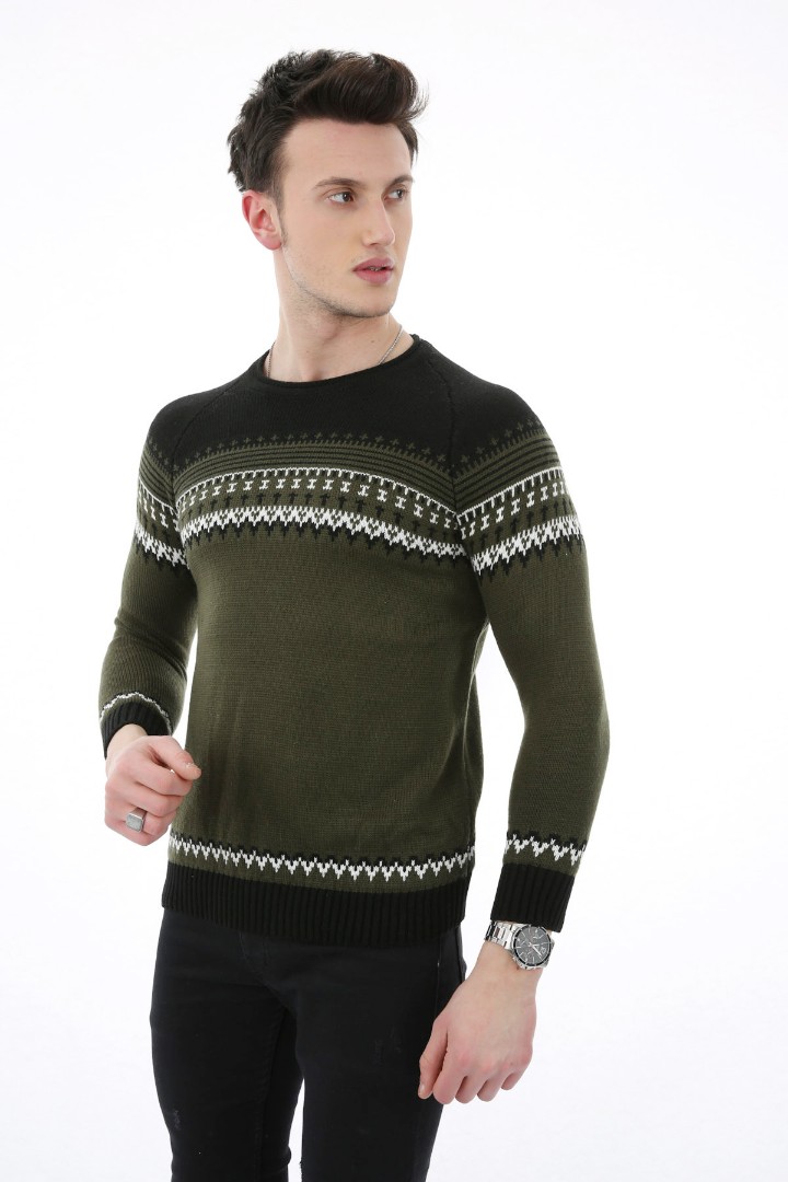 Desenli Haki Kalın Kışlık Günlük Triko Kazak