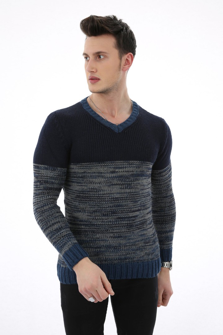 Desenli İki Renk V Yaka Erkek Günlük Triko Kazak
