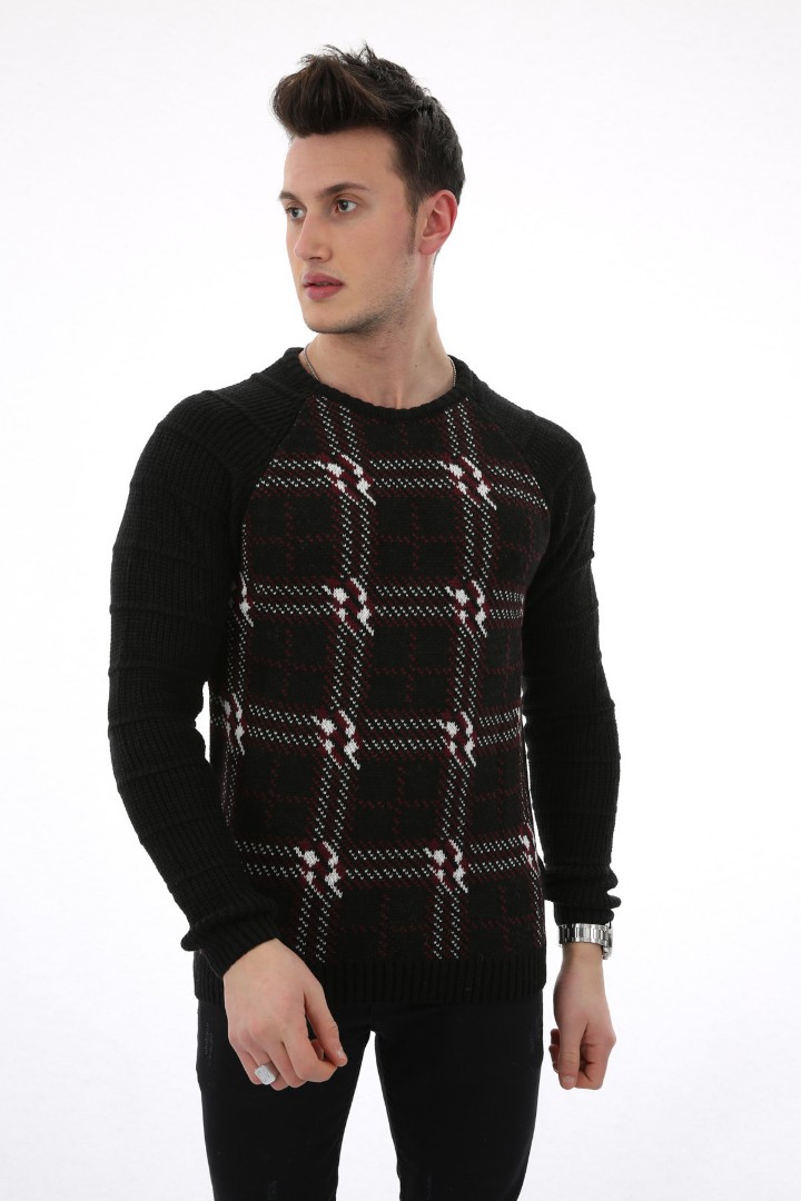 Ekose Desenli Sıfır Yaka Erkek Günlük Triko Kazak
