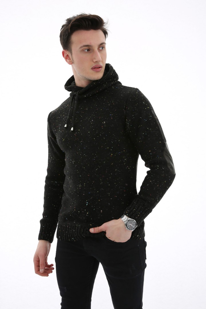 Erkek Düz Kırçıllı Kapşonlu Cepli Günlük Triko Kazak