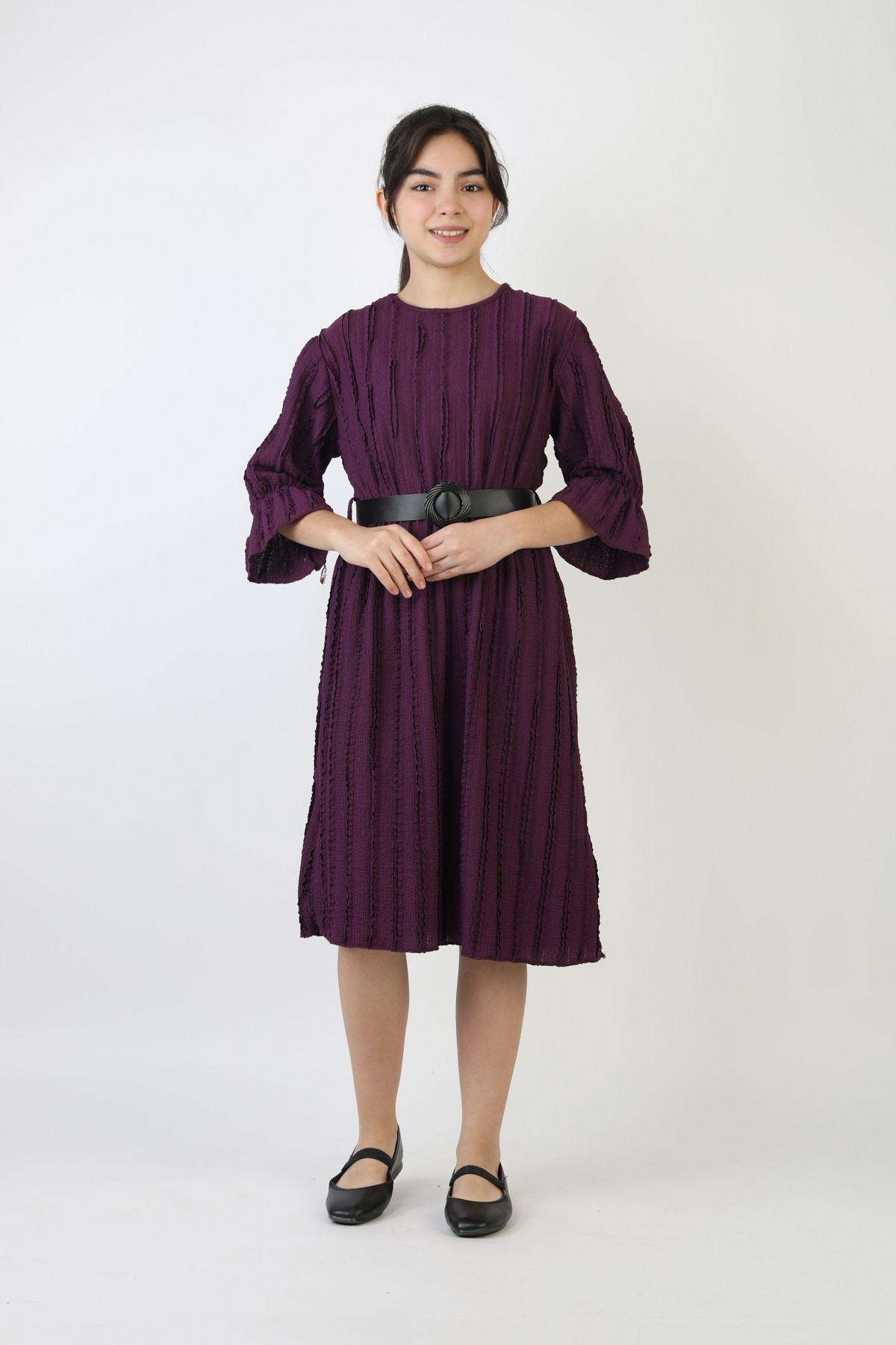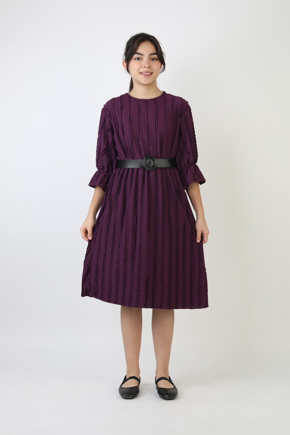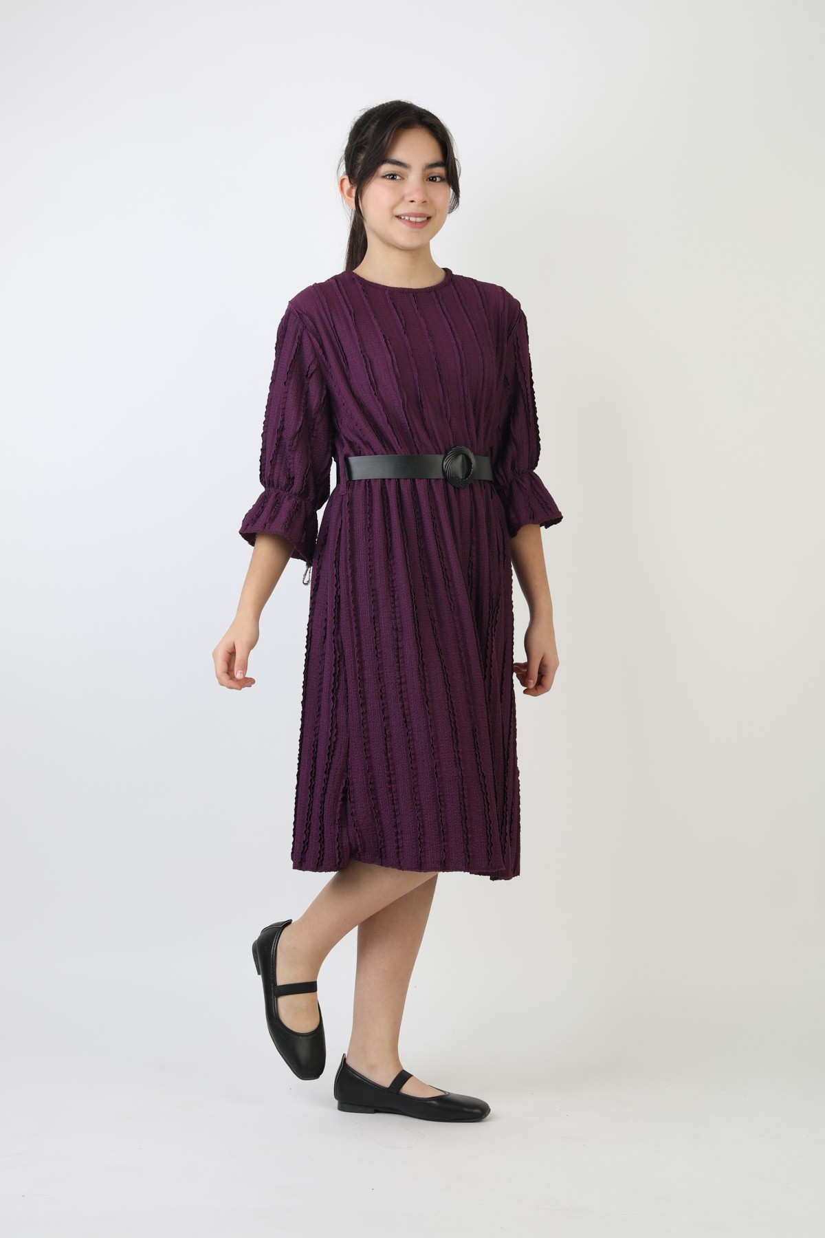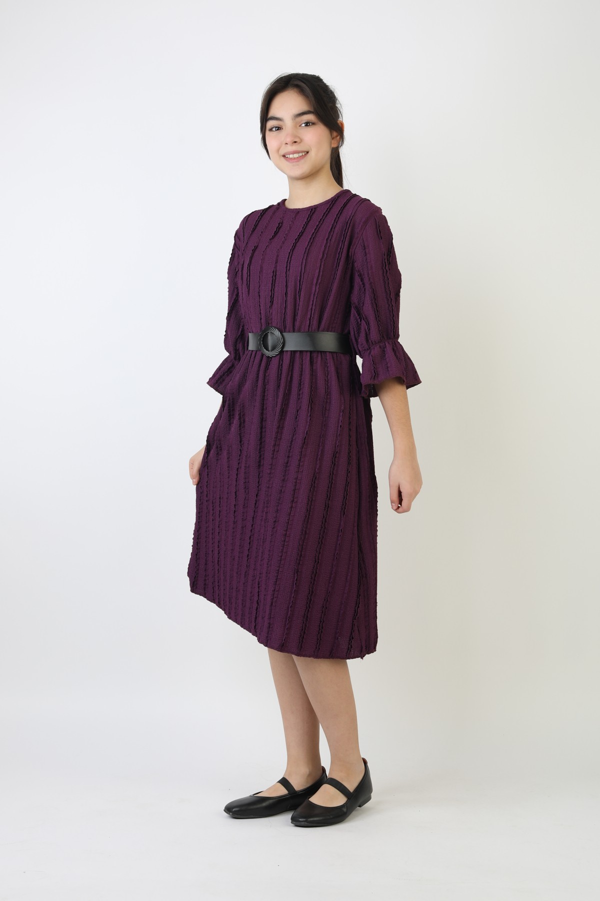Fırfırlı Bürümcük Kumaş Kız Çocuk Kemerli Günlük Şık ve Rahat Elbise