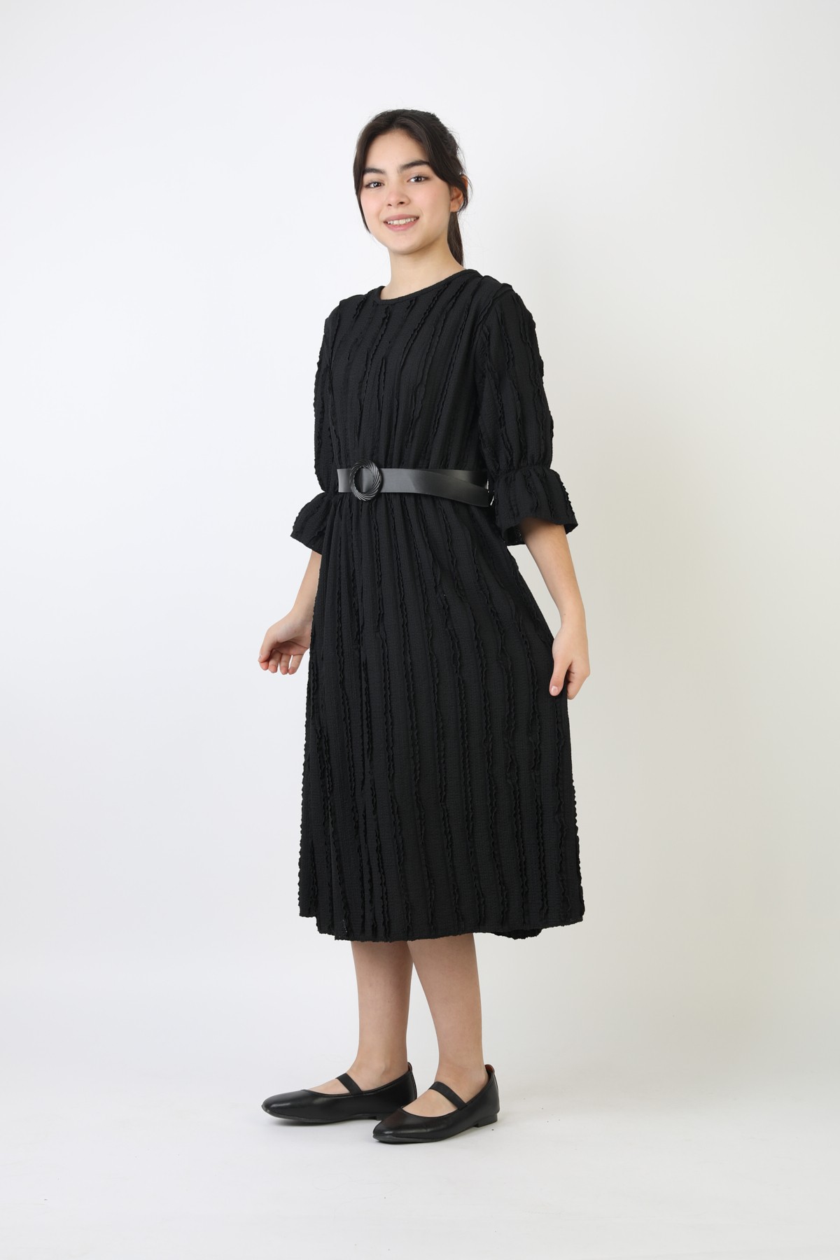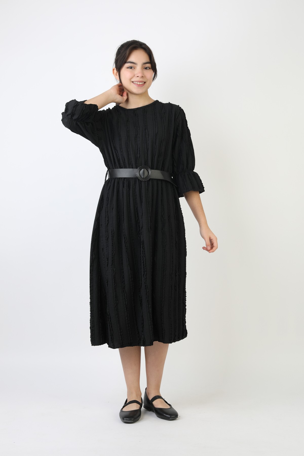 Fırfırlı Bürümcük Kumaş Kız Çocuk Kemerli Günlük Şık ve Rahat Elbise
