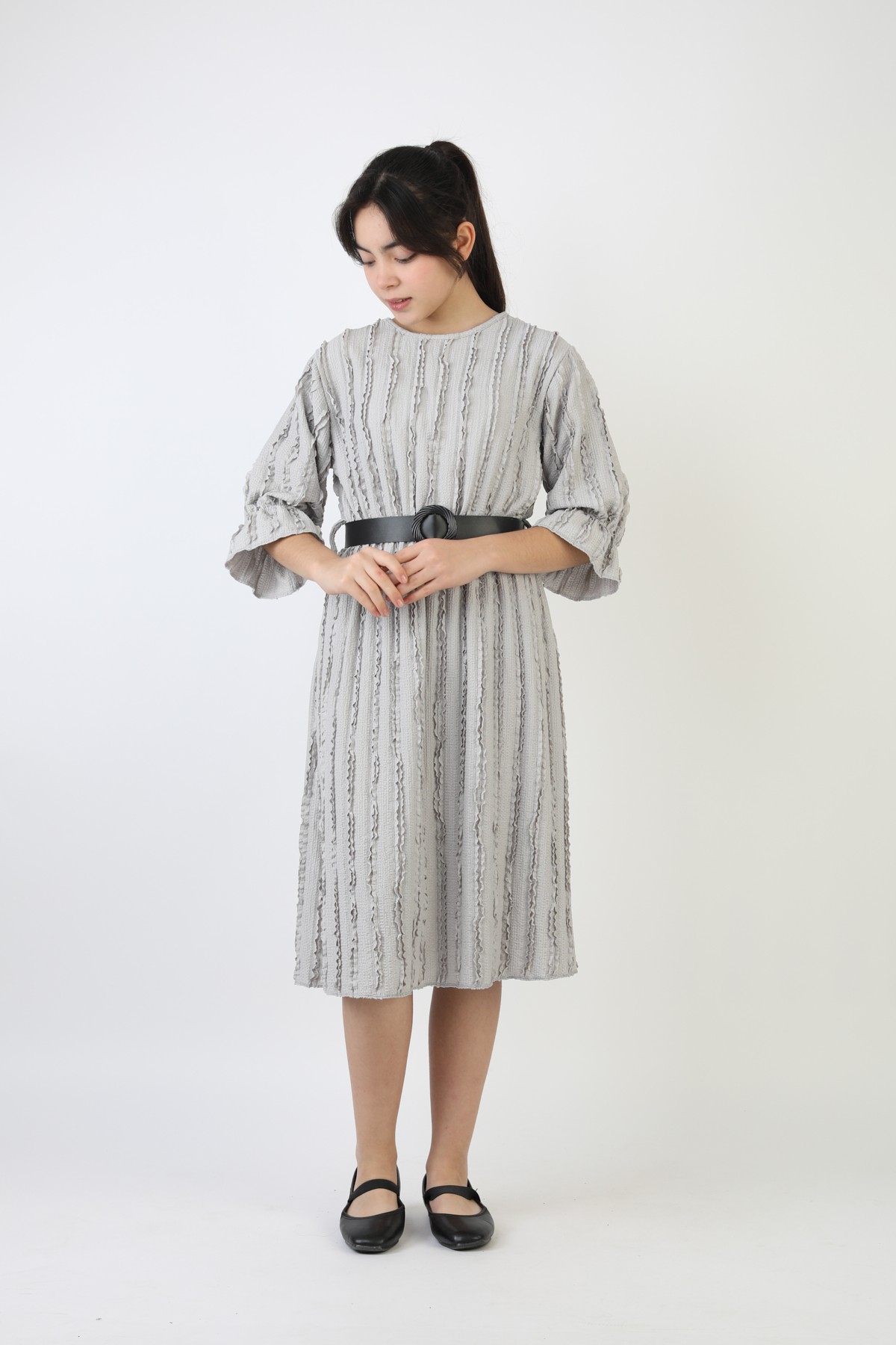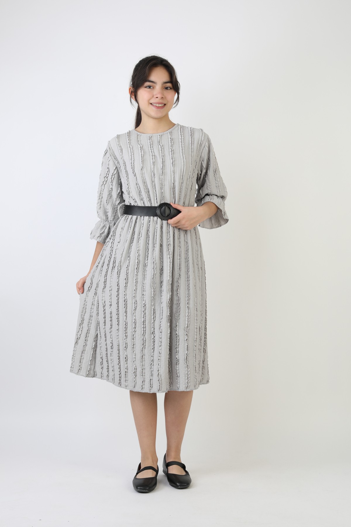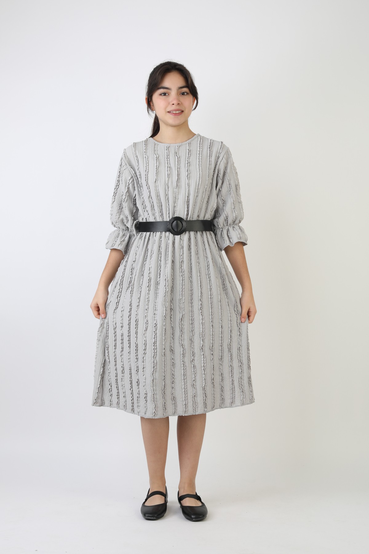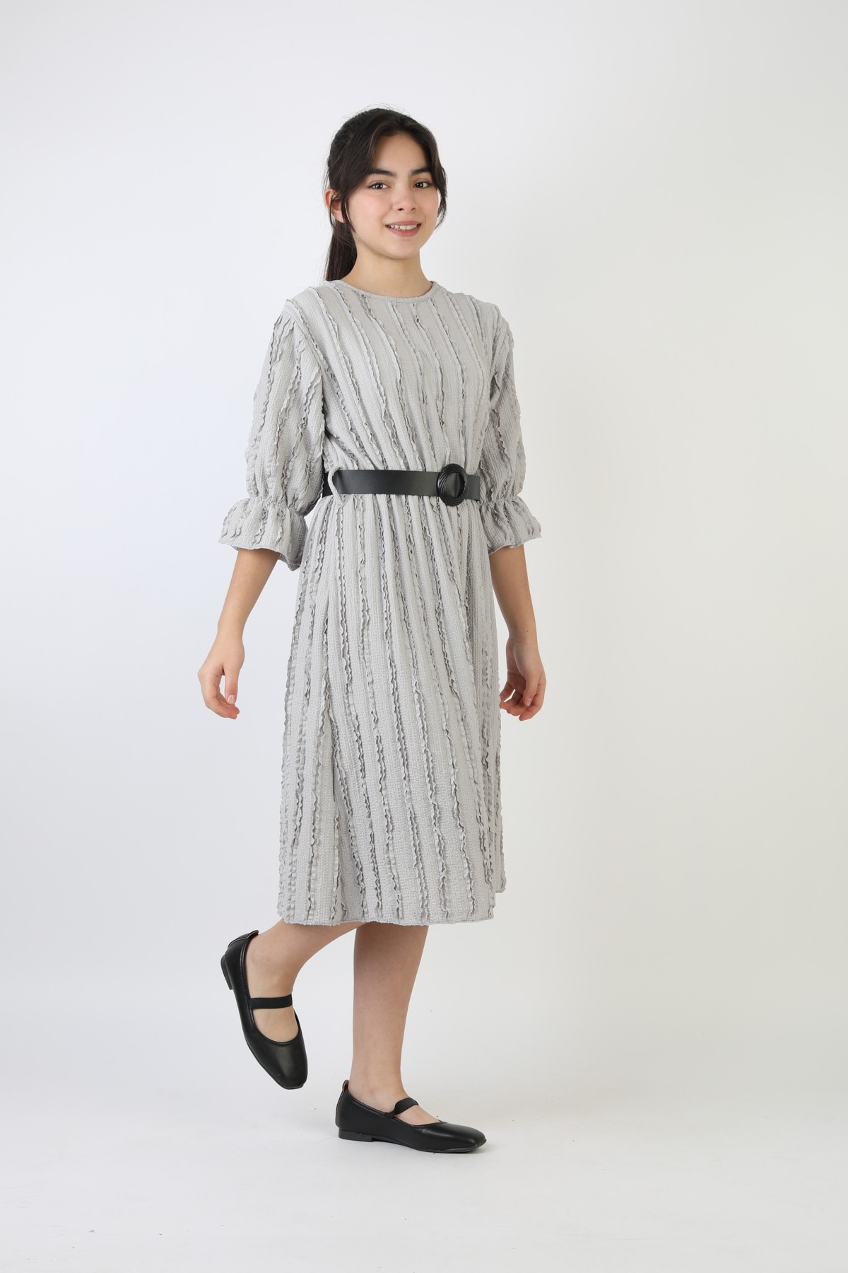 Fırfırlı Bürümcük Kumaş Kız Çocuk Kemerli Günlük Şık ve Rahat Elbise
