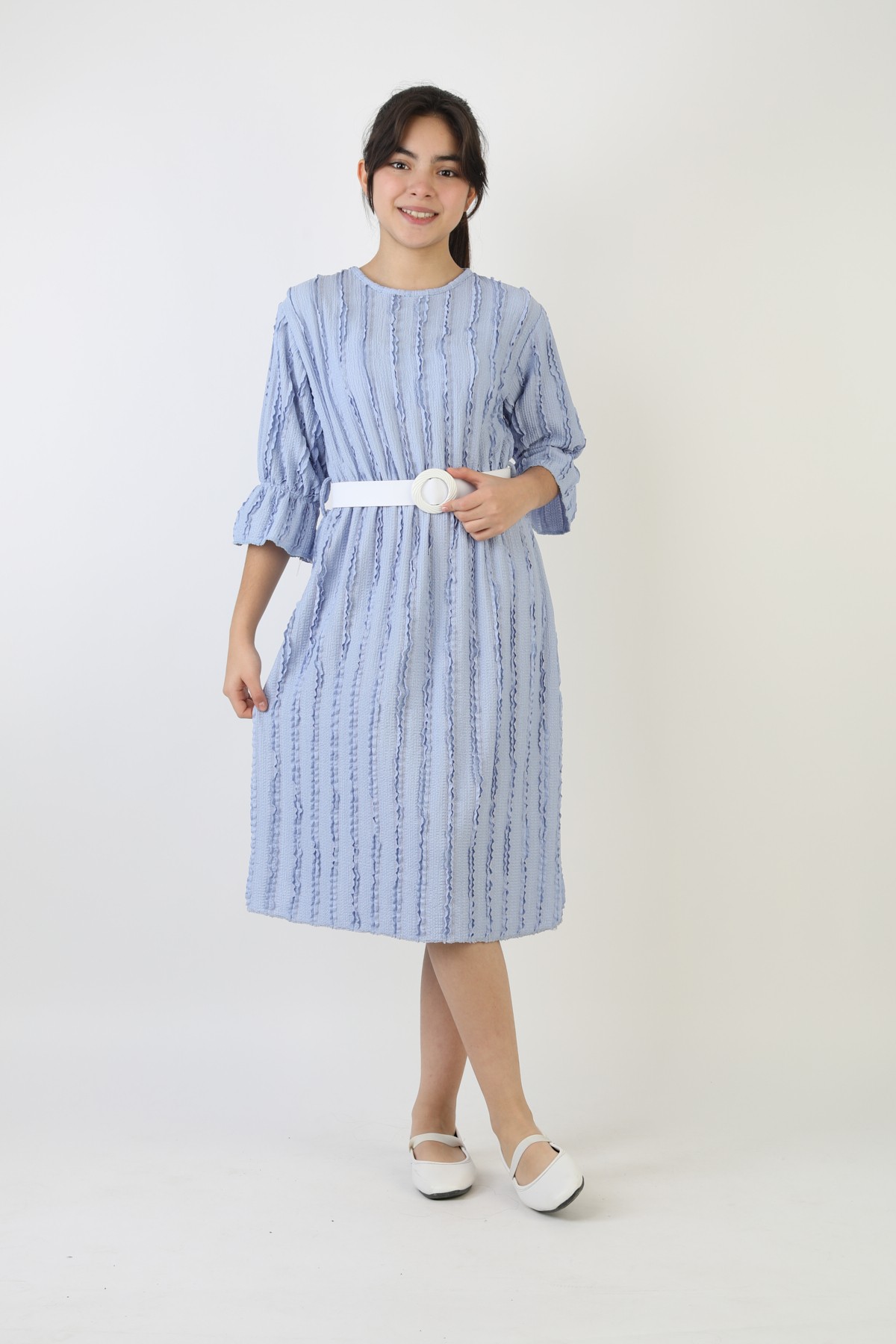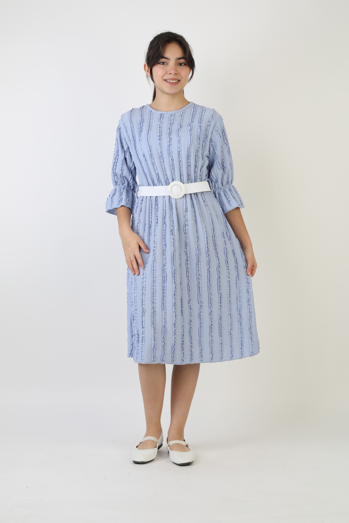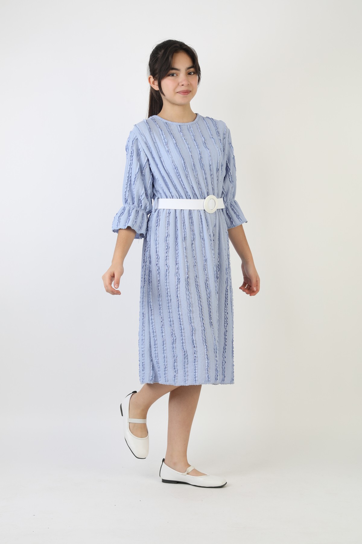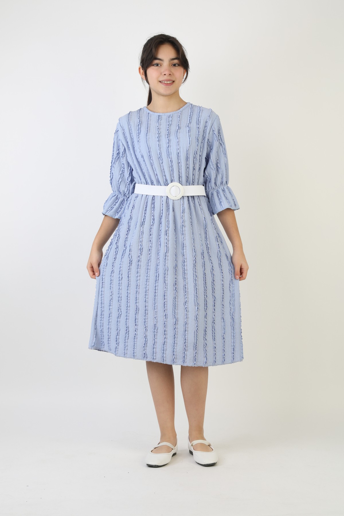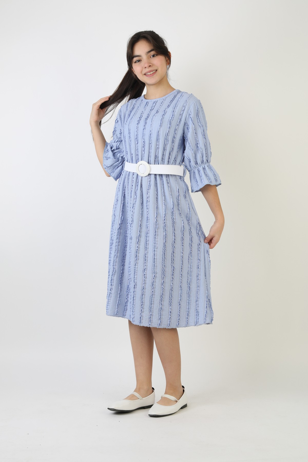 Fırfırlı Bürümcük Kumaş Kız Çocuk Kemerli Günlük Şık ve Rahat Elbise
