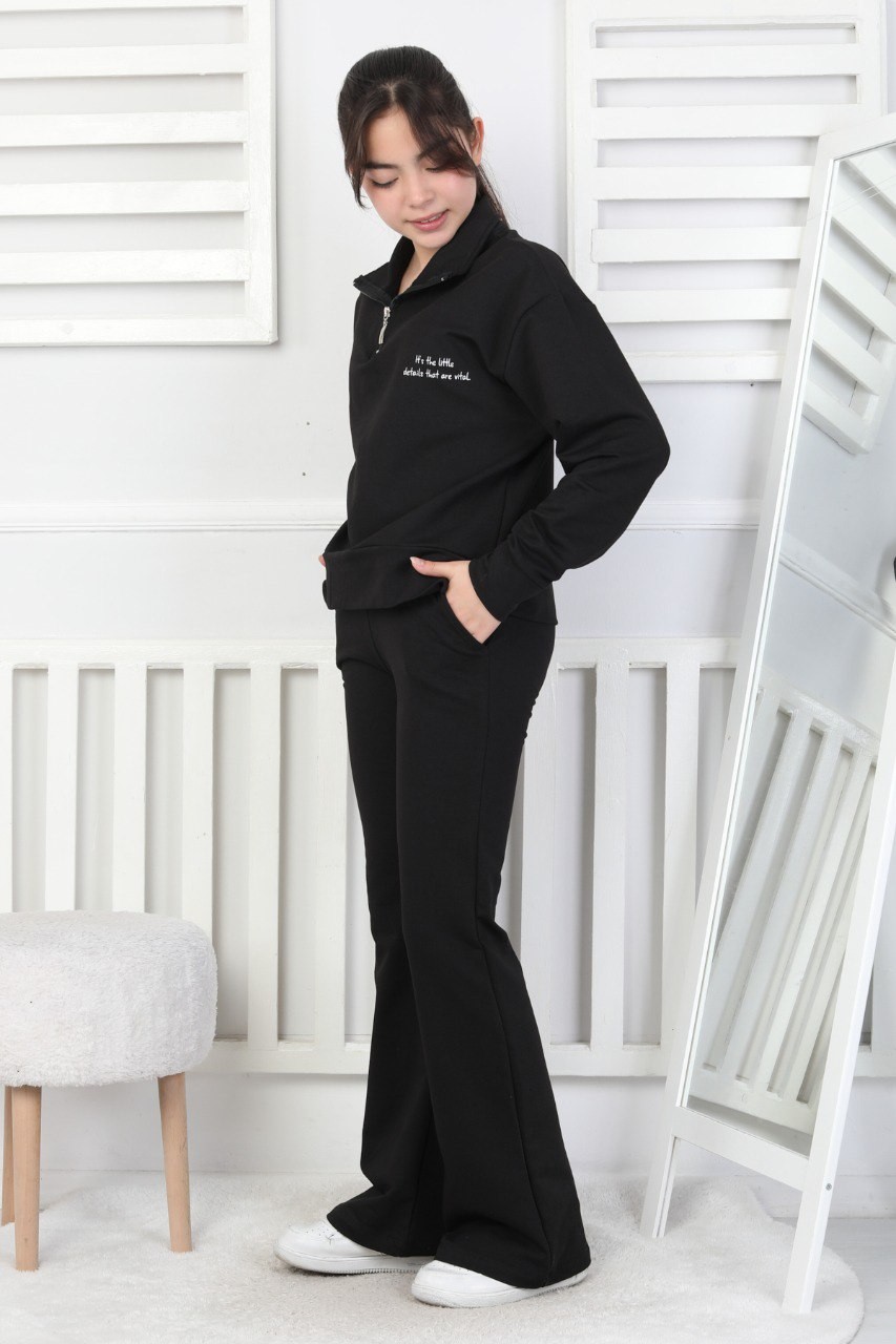 İki İplik Arkası Baskılı Yarım Fermuarlı Siyah Kız Çocuk İkili Takım