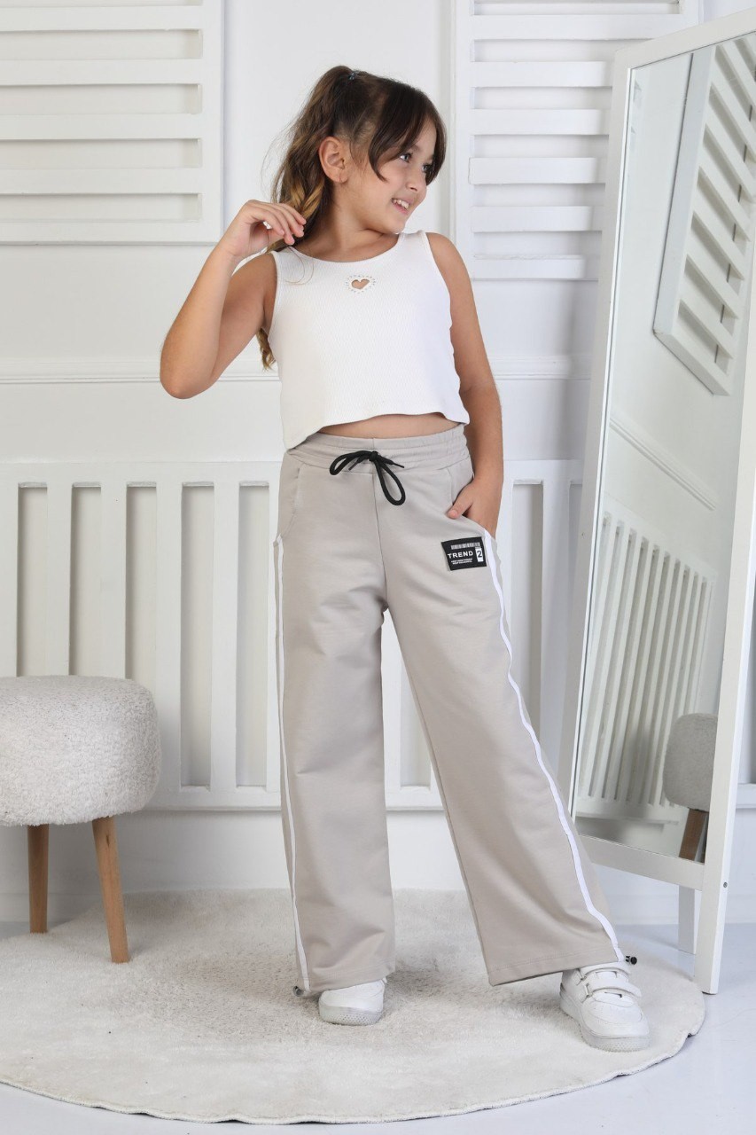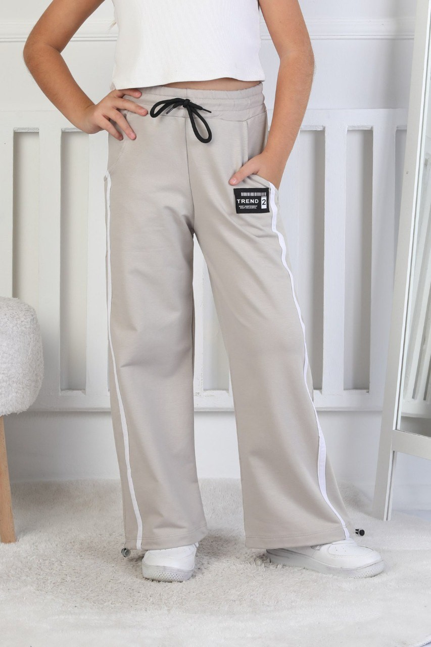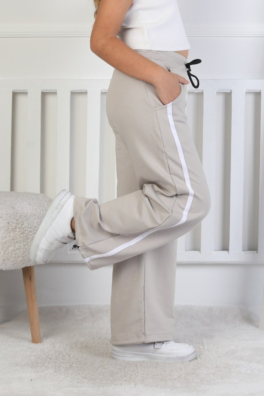 İki İplik Baskılı Çizgili Kız Çocuk Bej Eşofman Altı