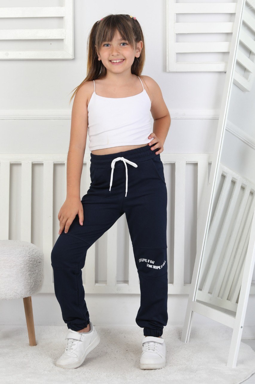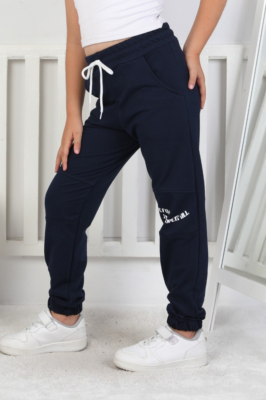 İki İplik Baskılı Kız Çocuk Lacivert Lastikli Paça Eşofman Altı