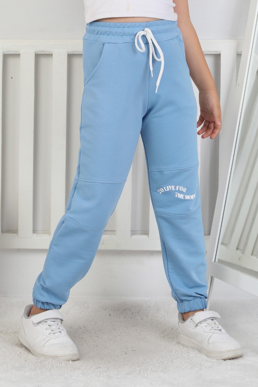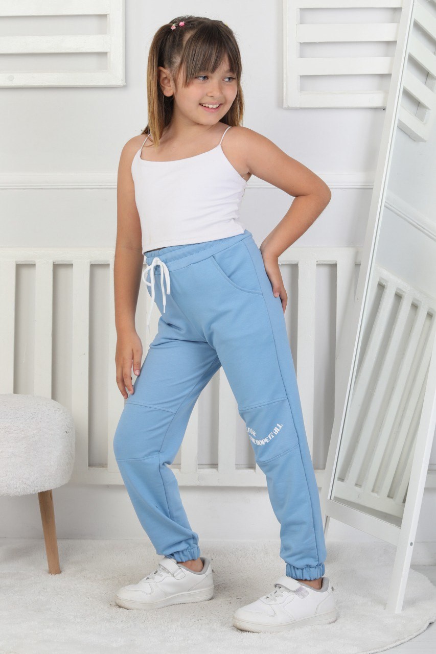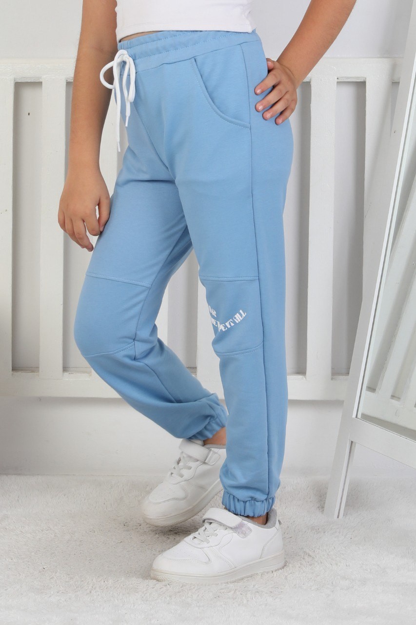 İki İplik Baskılı Kız Çocuk Lastikli Paça Mavi Eşofman Altı