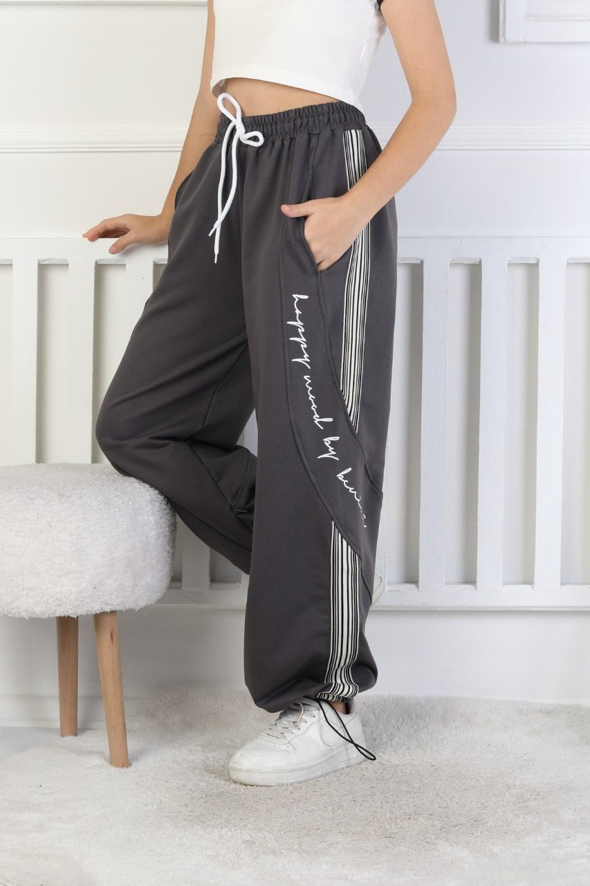 İki İplik Çizgili Baskılı Antrasit Kız Çocuk Eşofman Altı