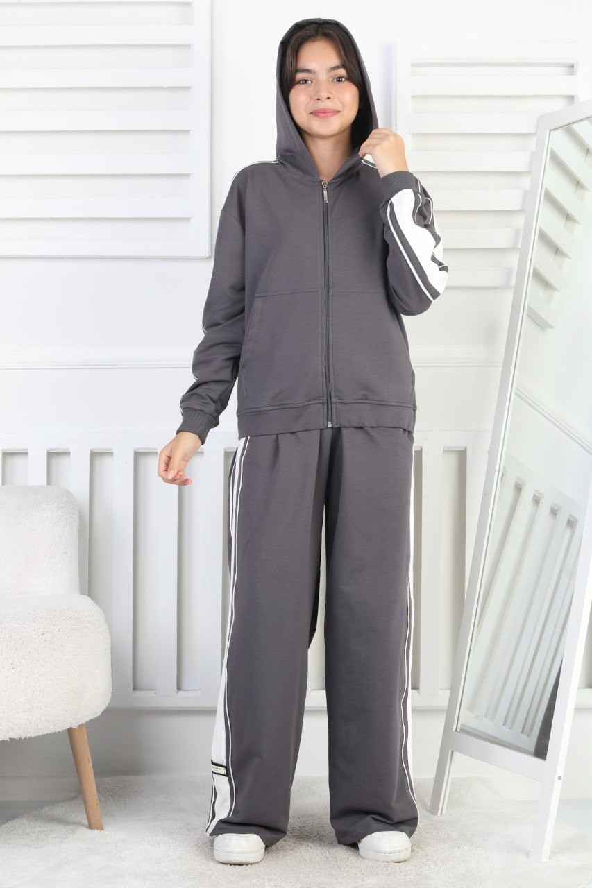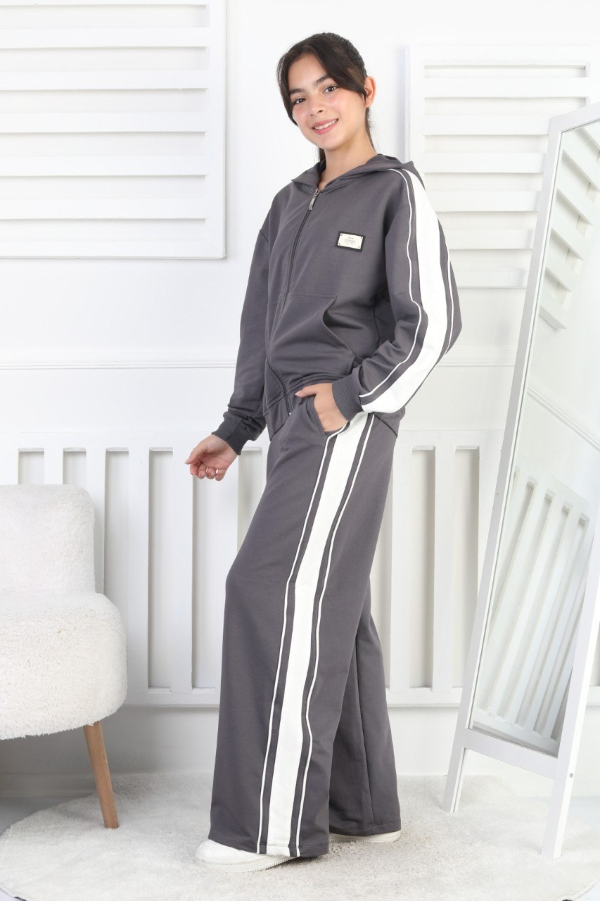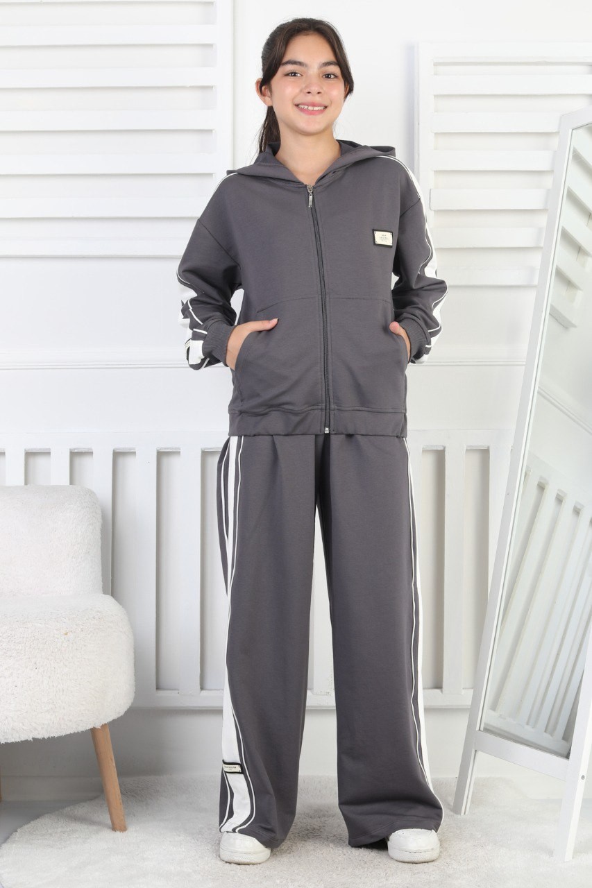 İki İplik Çizgili Kapşonlu Fermuarlı Kız Çocuk Takım