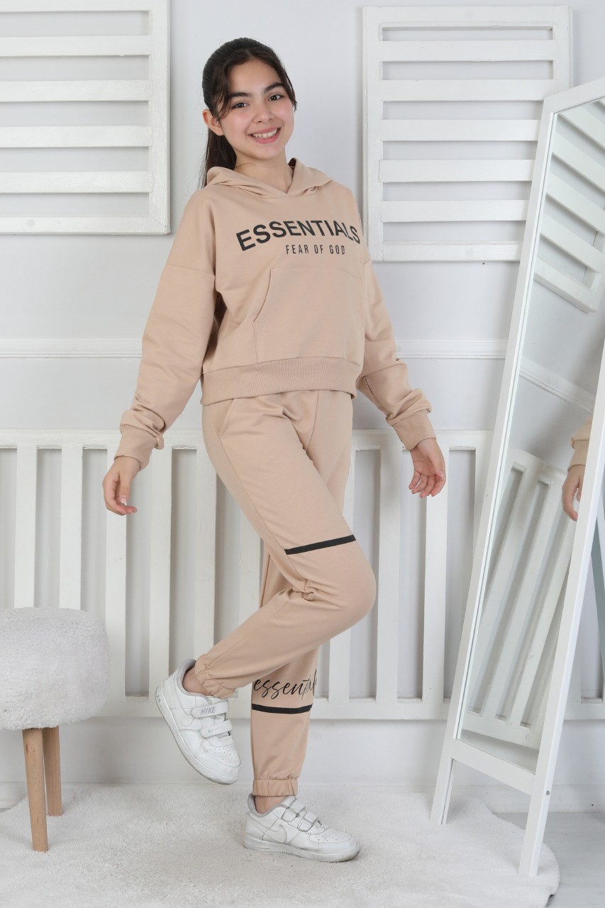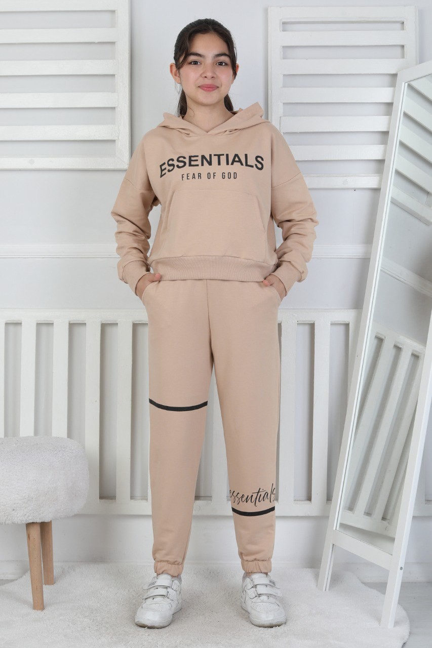 İki İplik Kapüşonlu Baskılı Kız Çocuk Bej İkili Takım