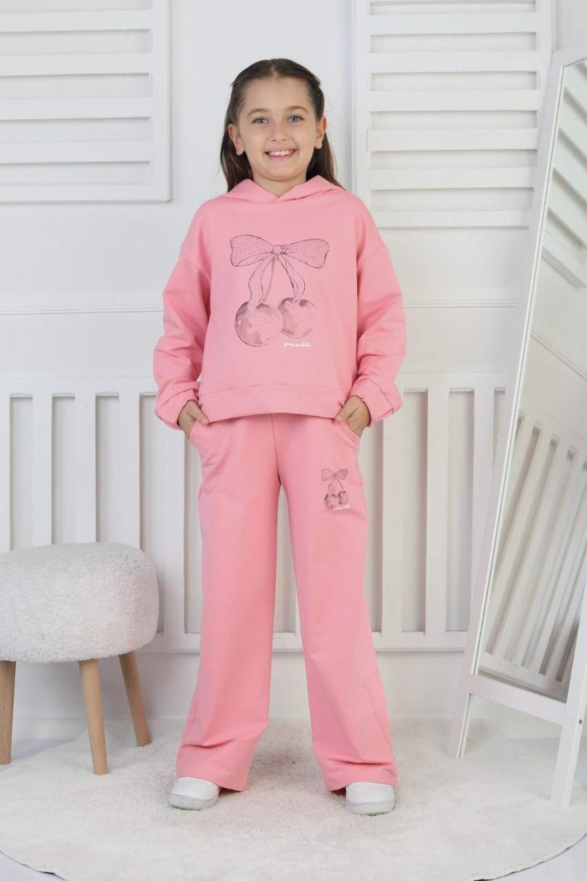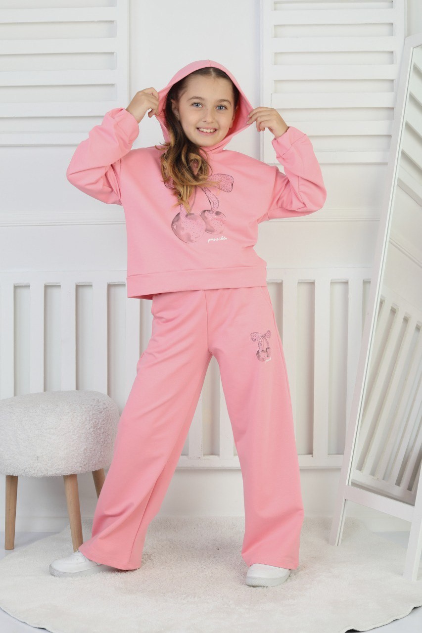 İki İplik Kapüşonlu Baskılı Kız Çocuk Pembe İkili Takım