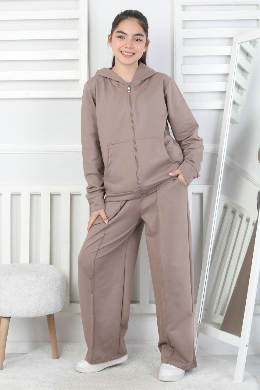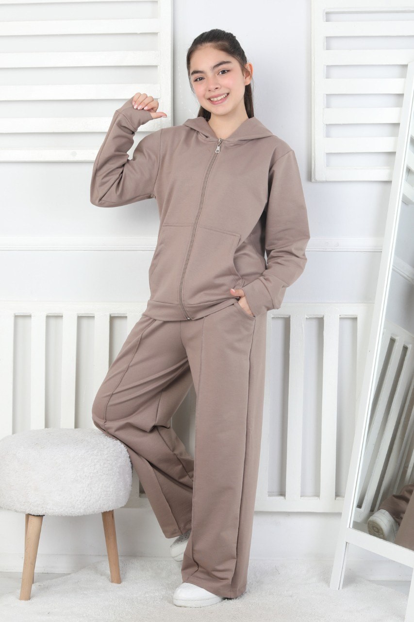 İki İplik Kapüşonlu Fermuarlı Kahverengi Kız Çocuk İkili Takım