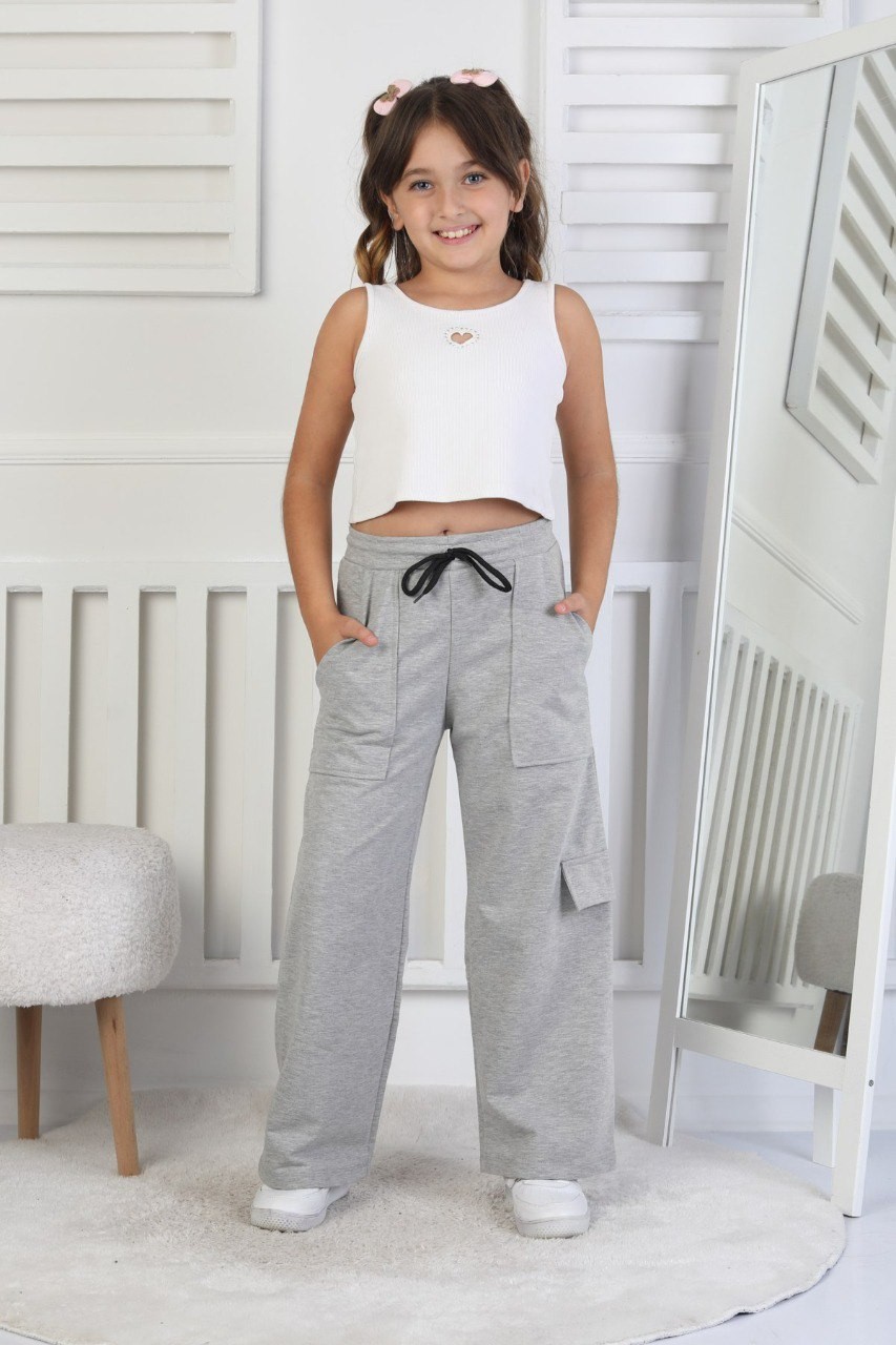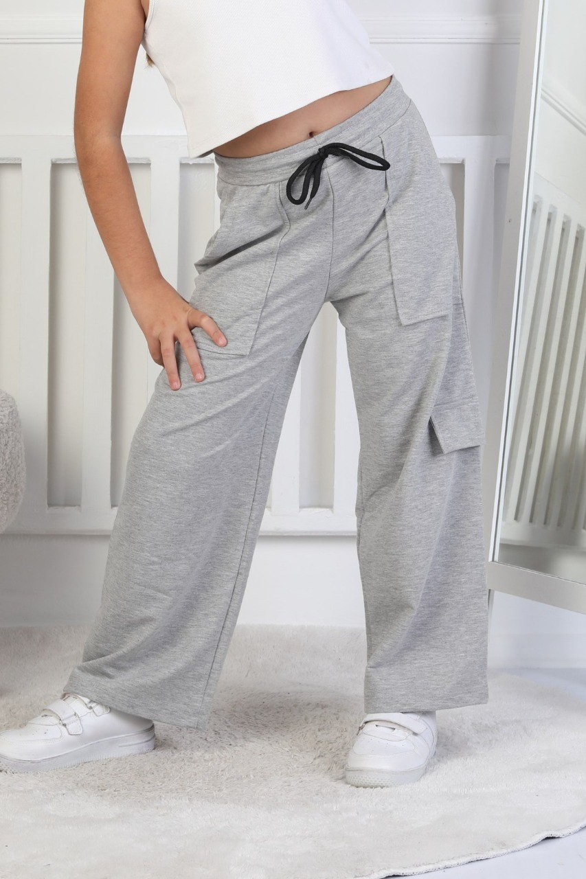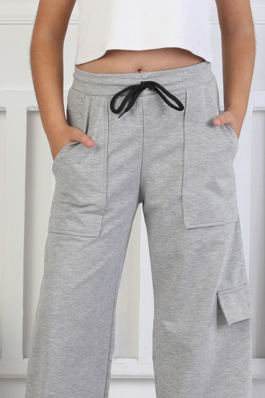 İki İplik Tek Paçası Kargo Cepli Kız Çocuk Gri Eşofman Altı