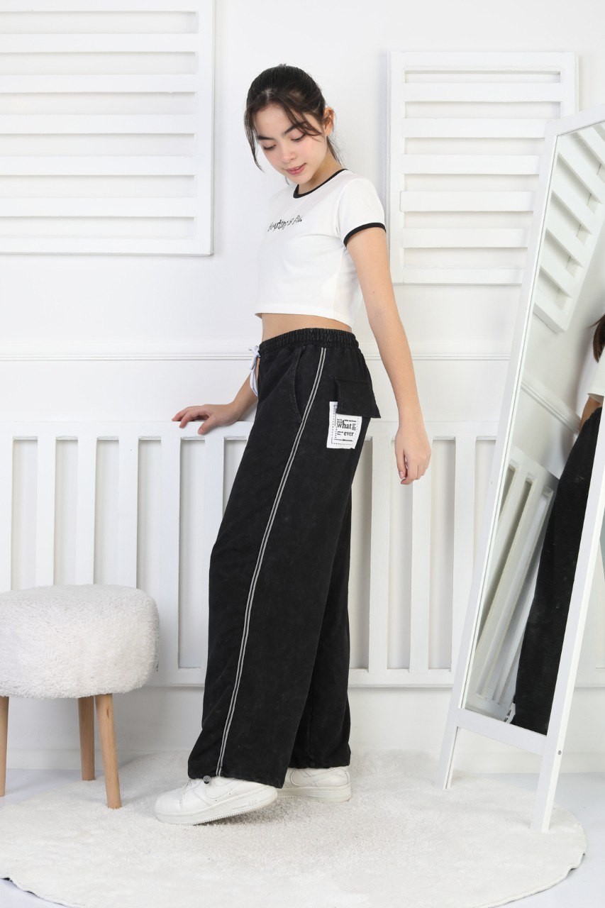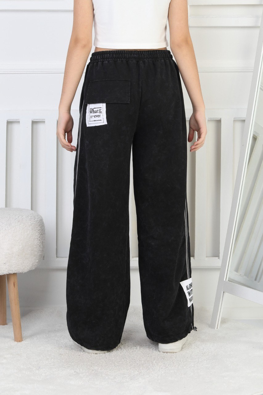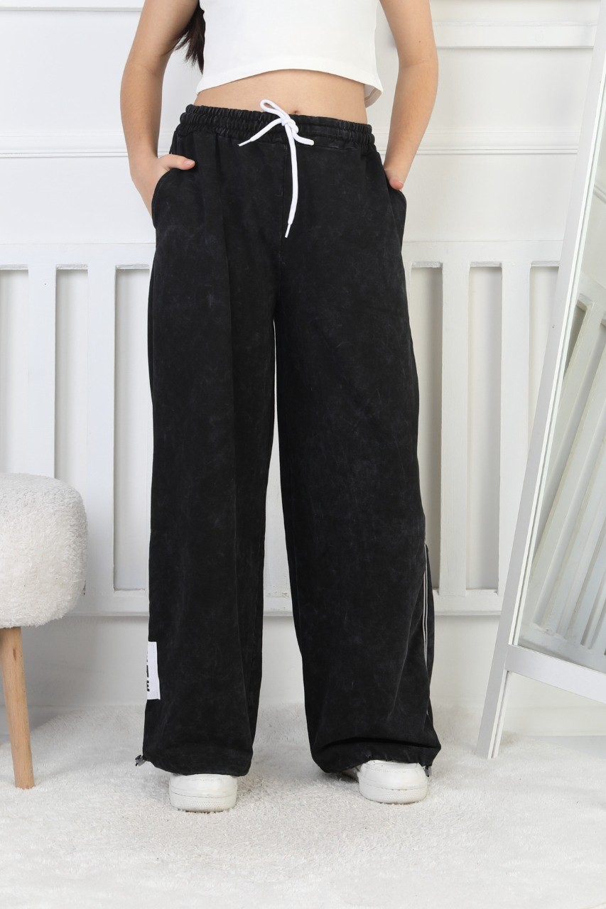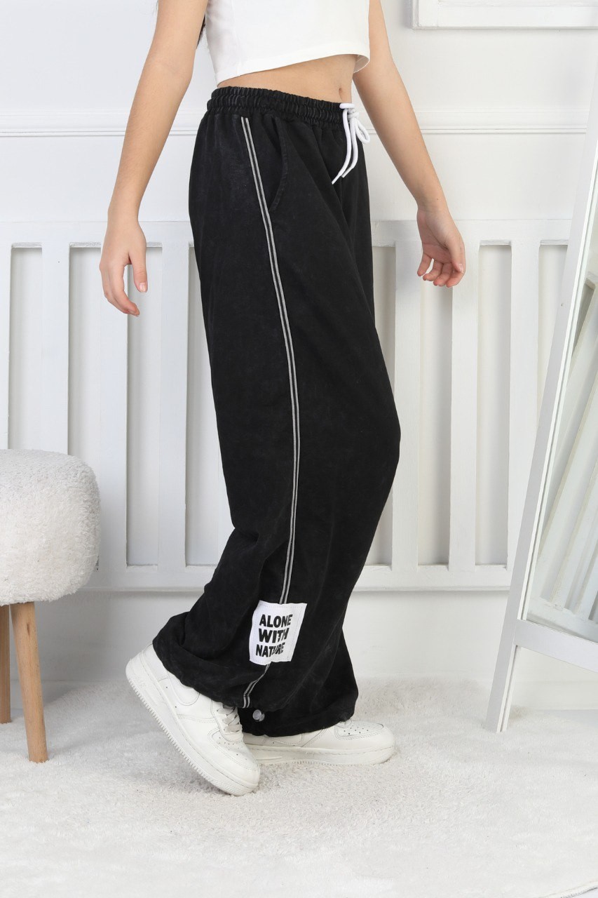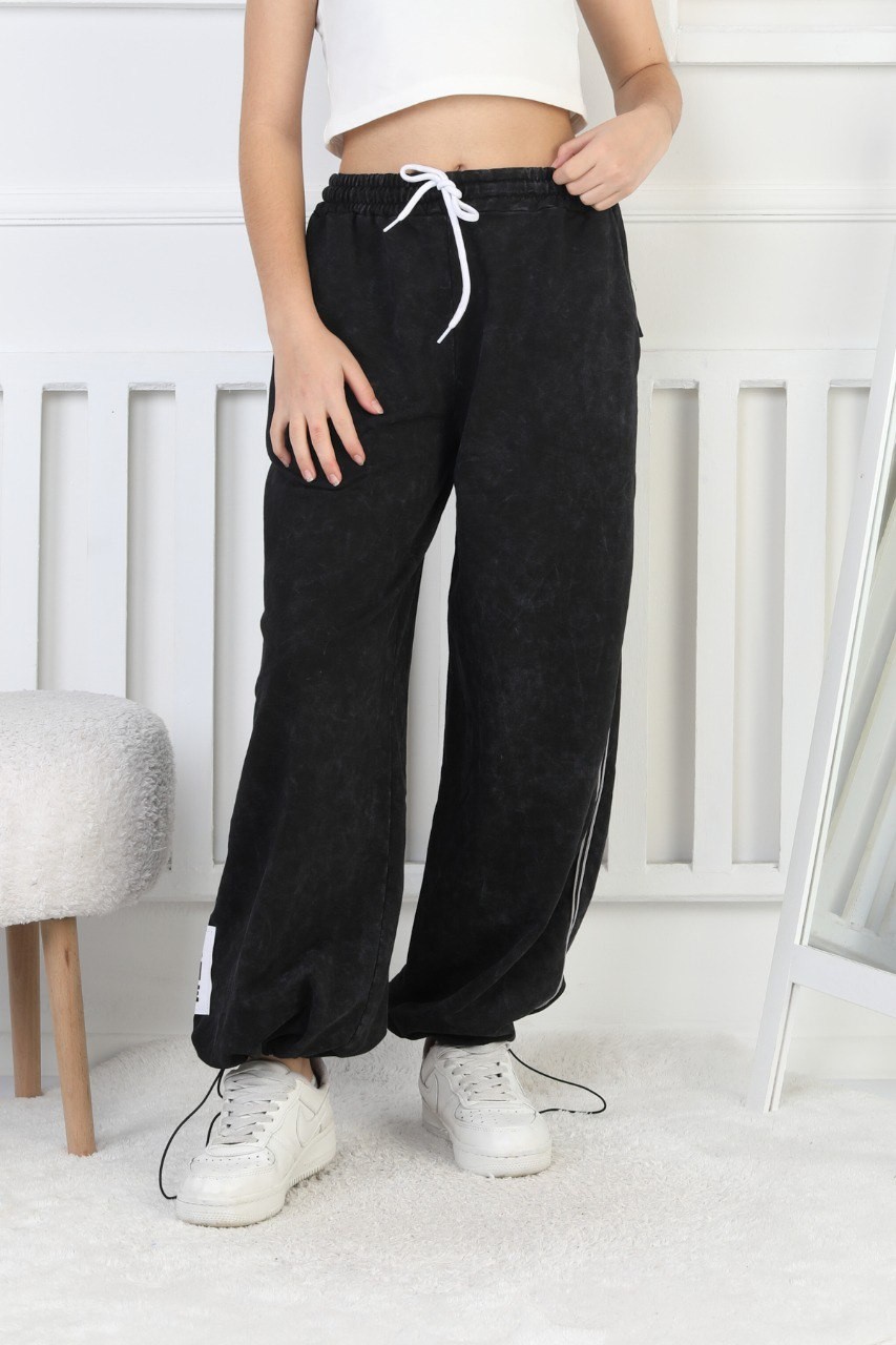 İki İplik Yıkamalı Dik Çizgili Baskılı Siyah Kız Çocuk Eşofman Altı