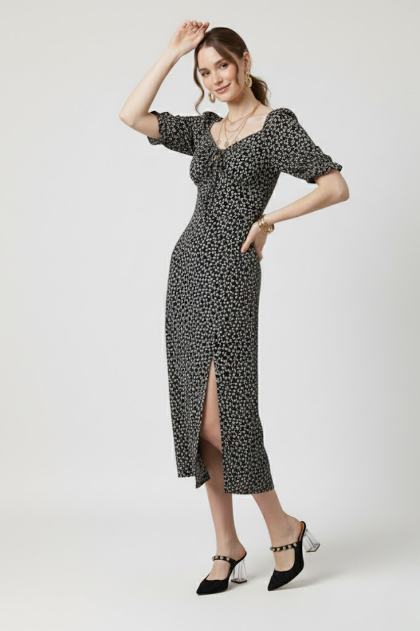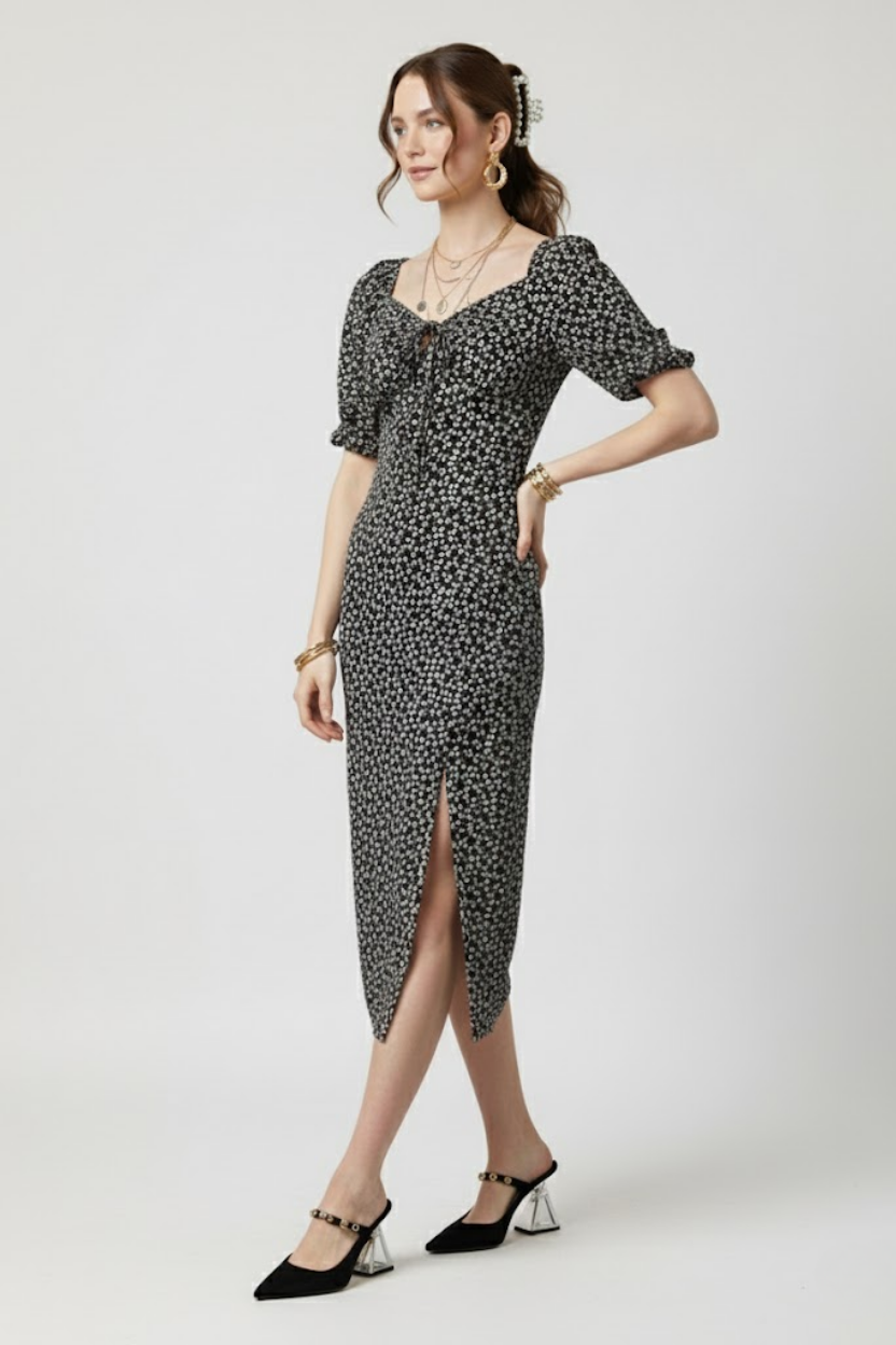 Zamansız tasarımı ve siyah-beyazın asaletini bir araya getiren bu çiçek desenli midi elbise, gardırobunuzun her mevsim tercih edilen anahtar parçası olacak. İster tek başına, ister favori ceket ve botlarınızla kombinleyebileceğiniz bu tasarım, şıklığı konforla birleştiriyor.