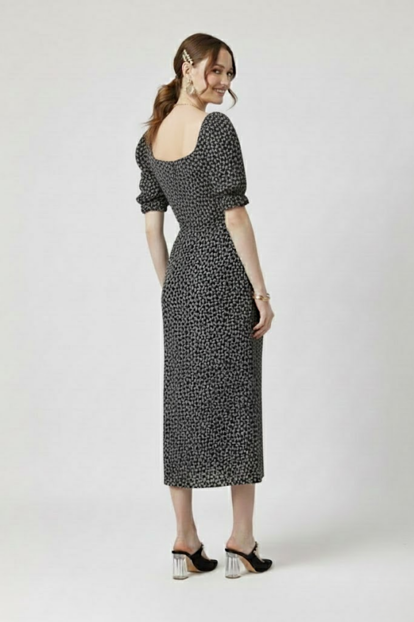 Kadın Siyah Çiçek Desenli Yırtmaçlı Midi Elbise Kare Yaka Büzgü Detaylı