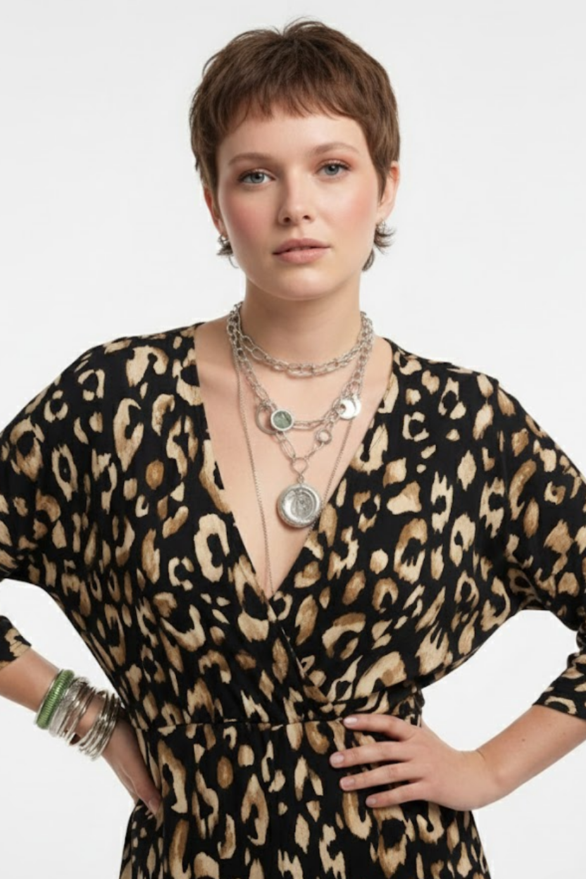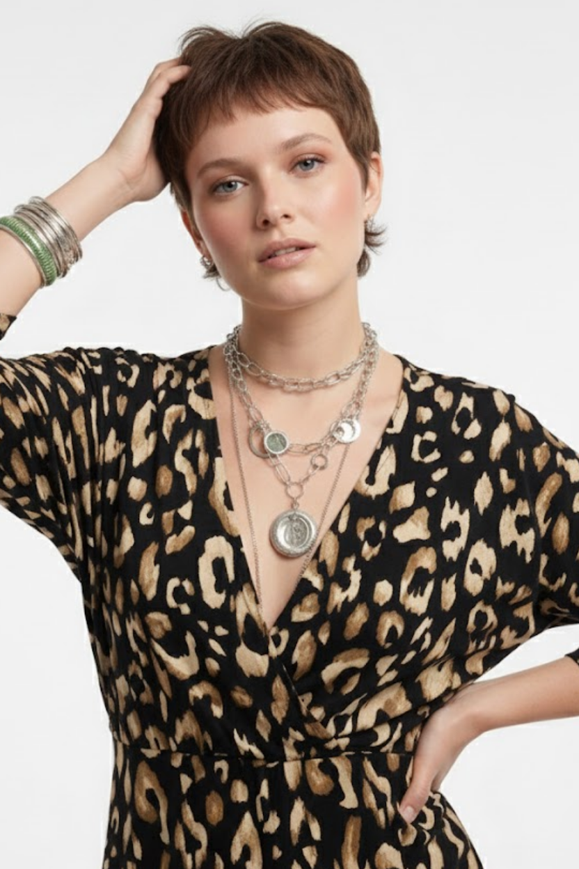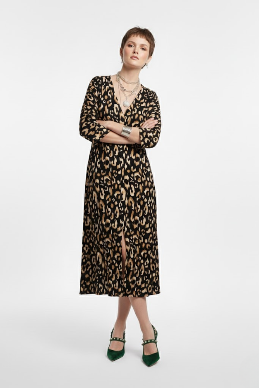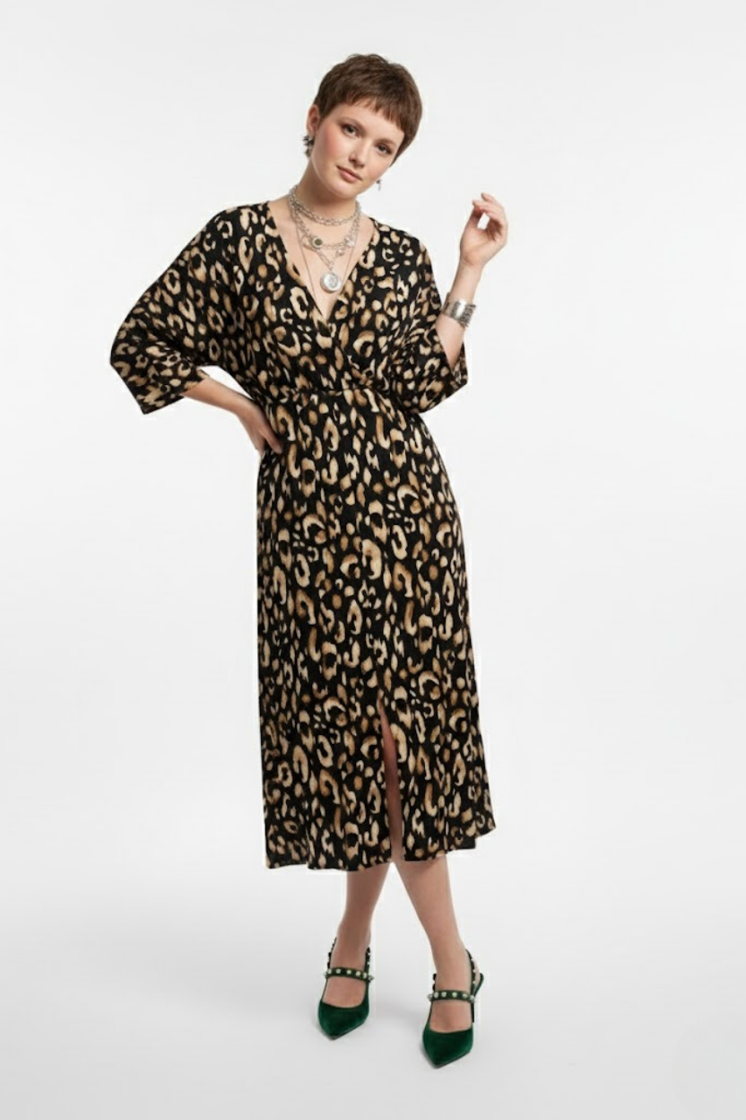 Kadın Siyah Leopar Desenli Bürümcük Dokuma Kruvaze Yaka Yarasa Kol Önü Yırtmaçlı Midi Elbise