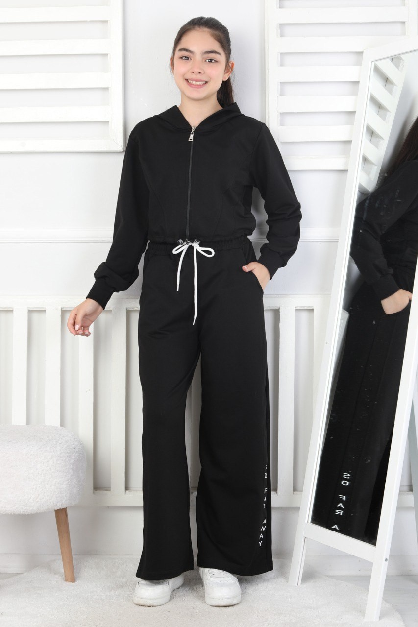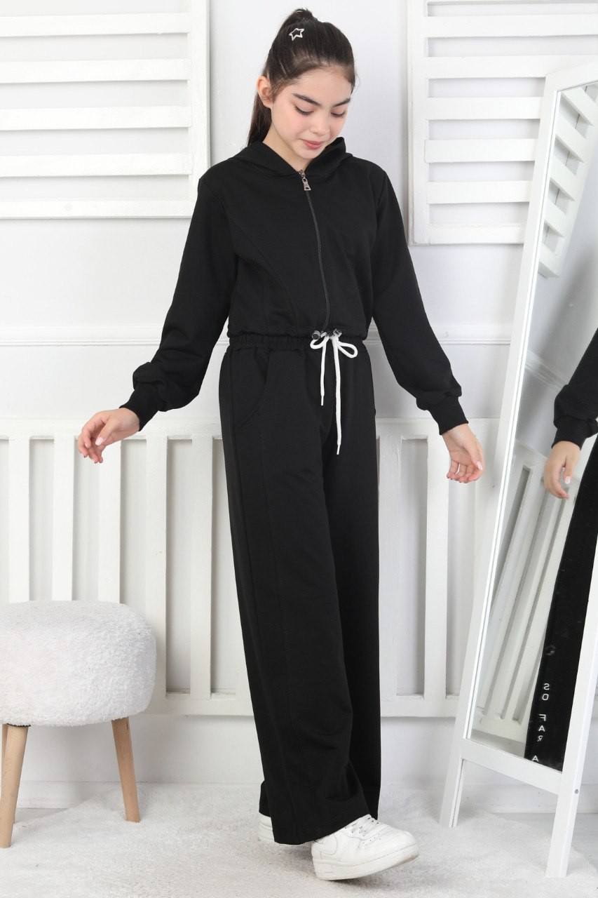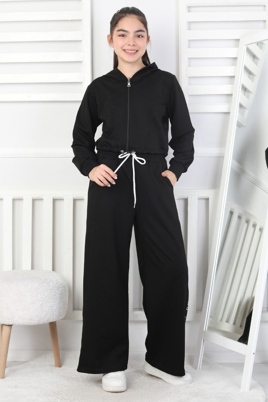 Kapüşonlu Fermuarlı Bol Paça Siyah Kız Çocuk İkili Takım