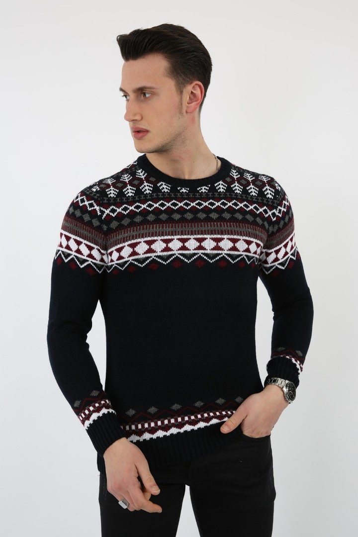 Karışık Desenli Lacivert Kalın Kışlık Günlük Triko Kazak