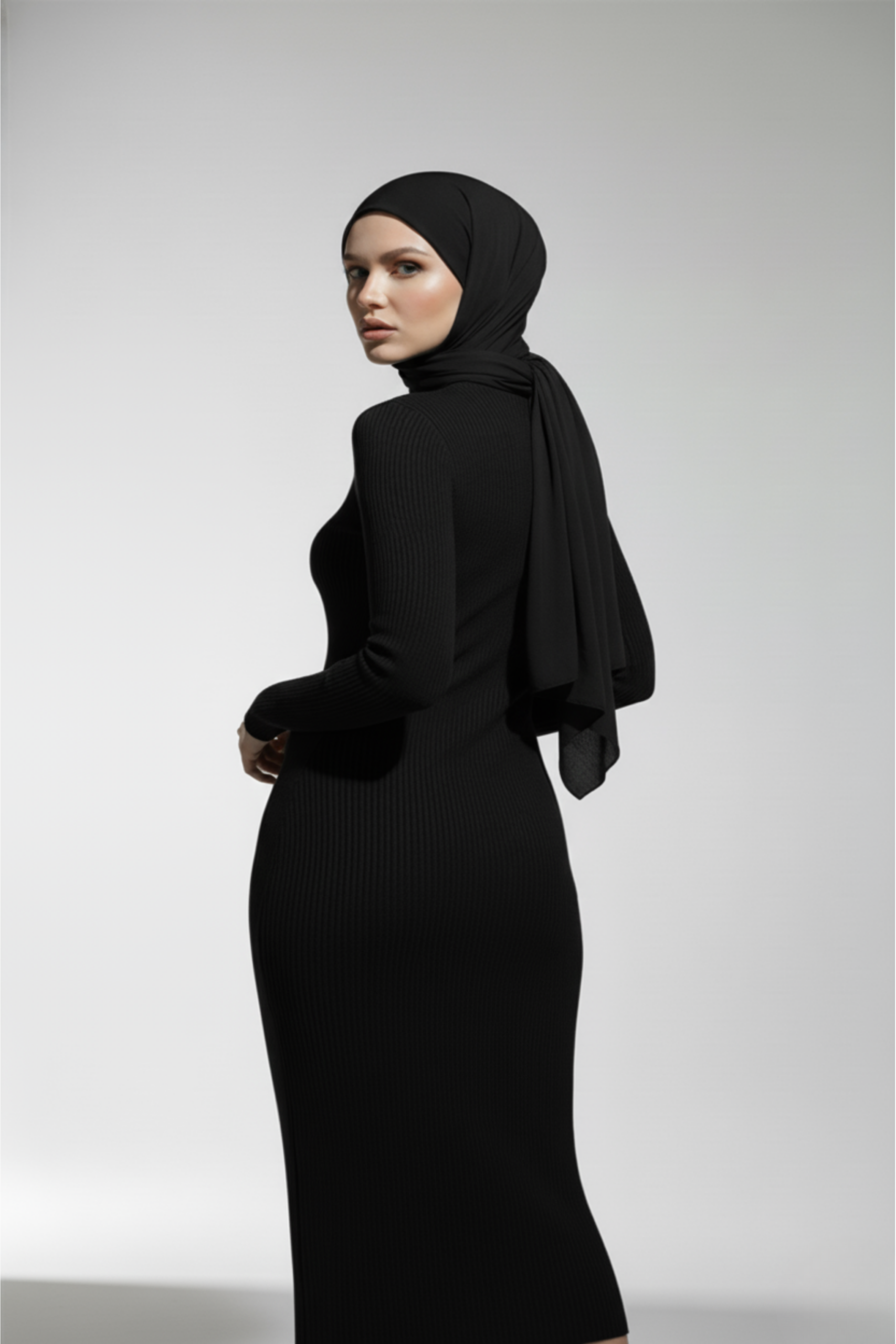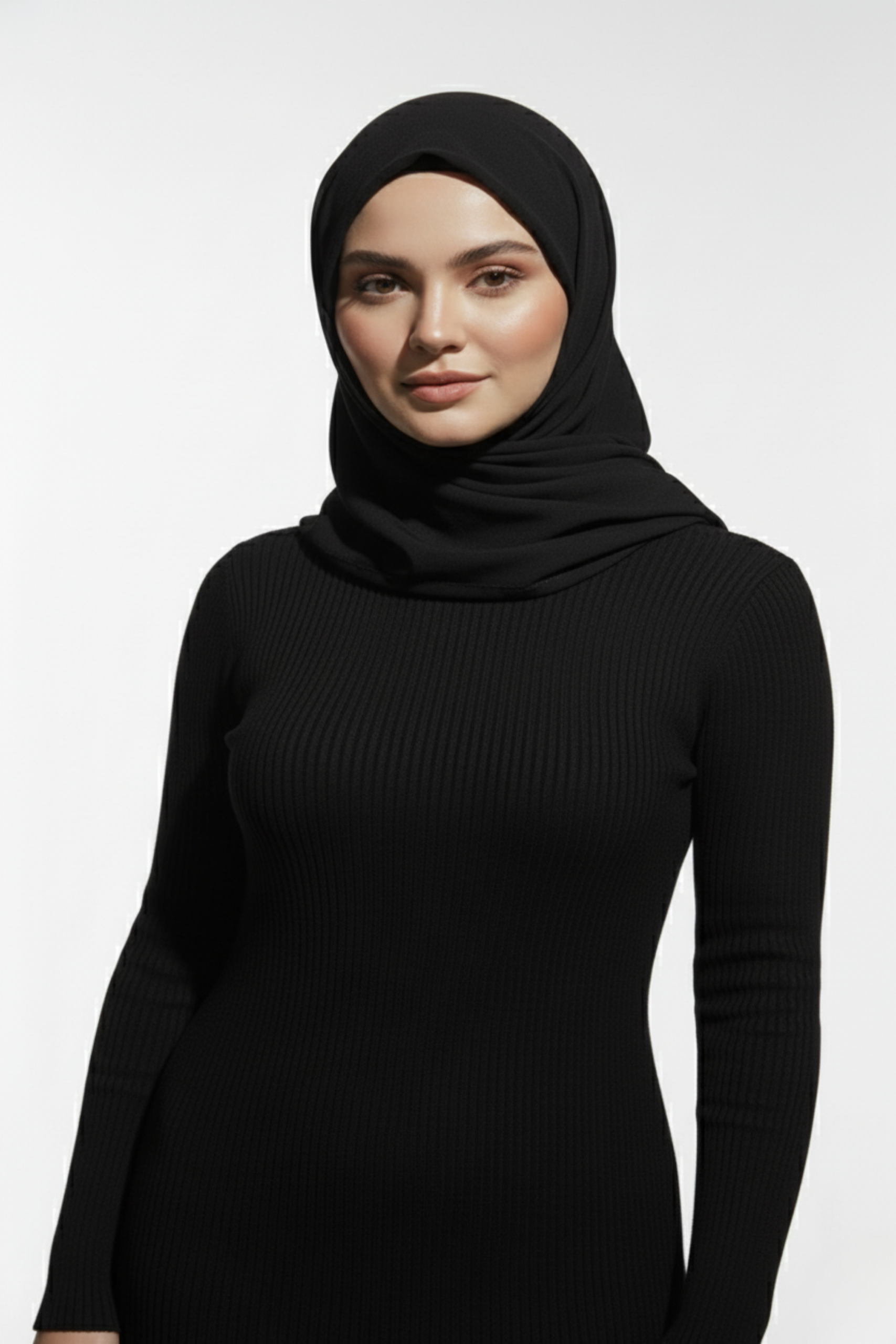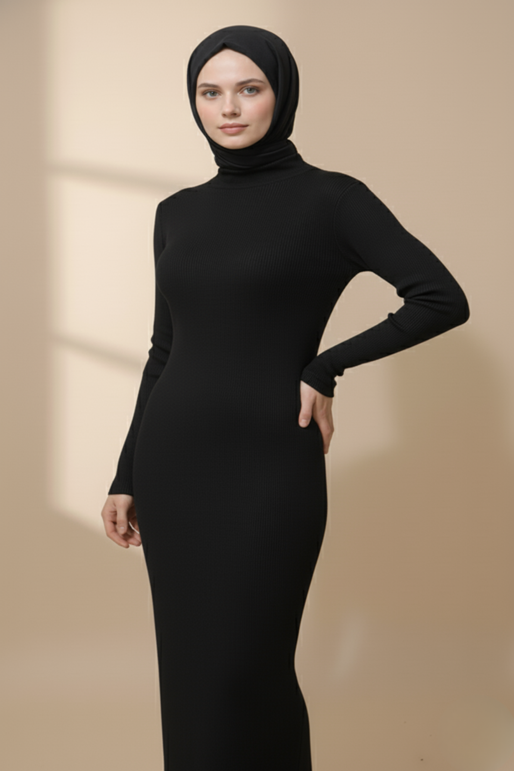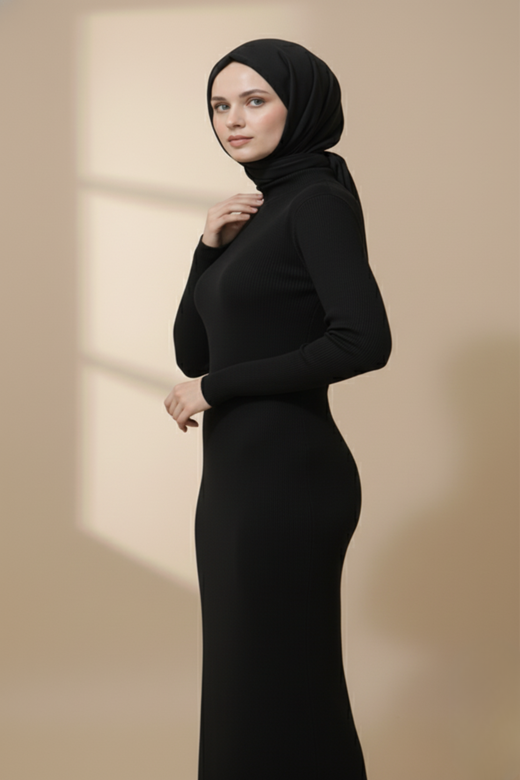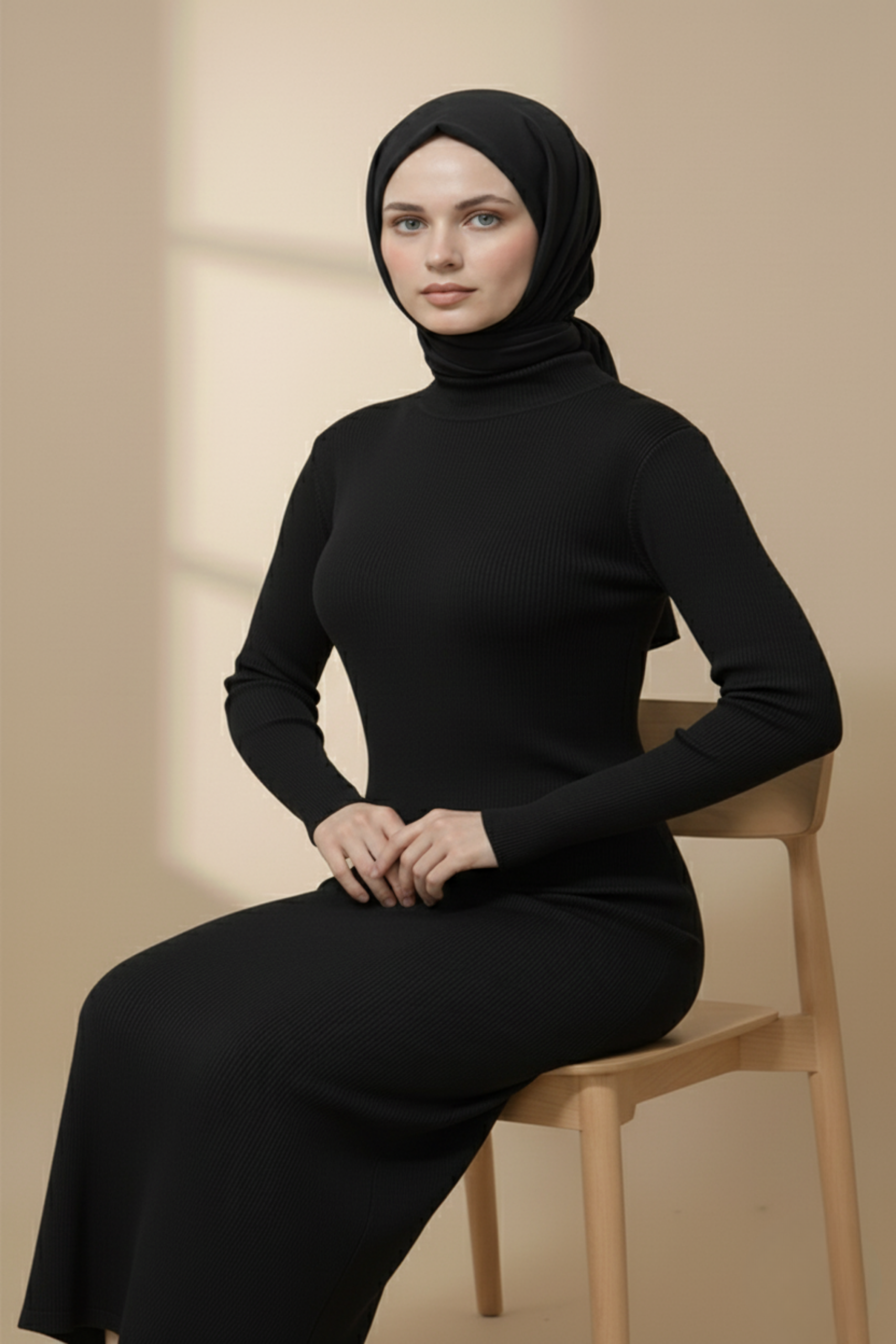 Balıkçı Yaka Siyah Uzun Elbise Tesettür
