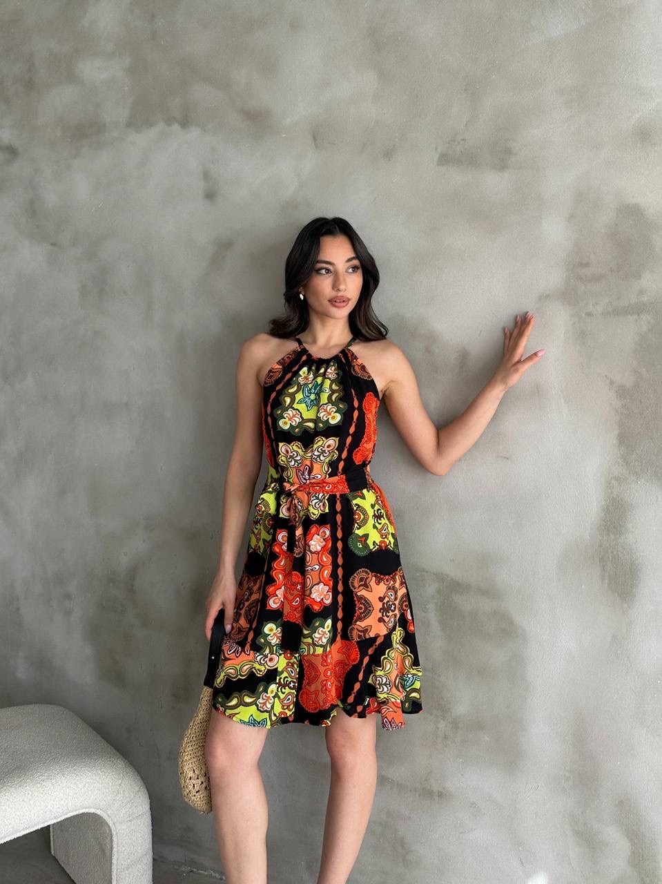 Siyah zemin üzerine turuncu ve yeşil tonların uyumuyla tasarlanan bu desenli kloş elbise, zarif ve enerjik bir görünüm sunar. Boyundan ayarlamalı askı detayı sayesinde vücuda tam oturur; bel kısmındaki kuşak, bel hattını zarifçe vurgulayarak feminen bir siluet oluşturur.