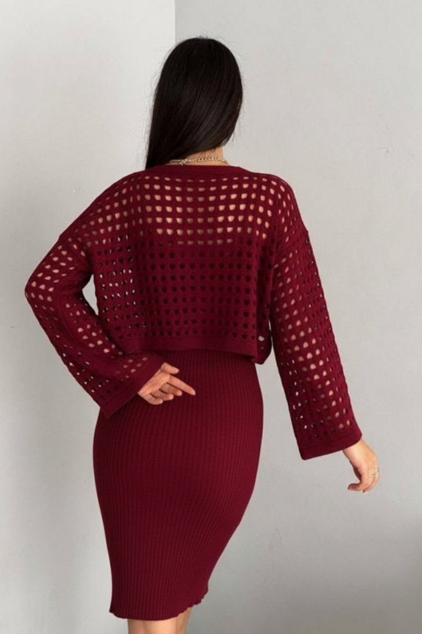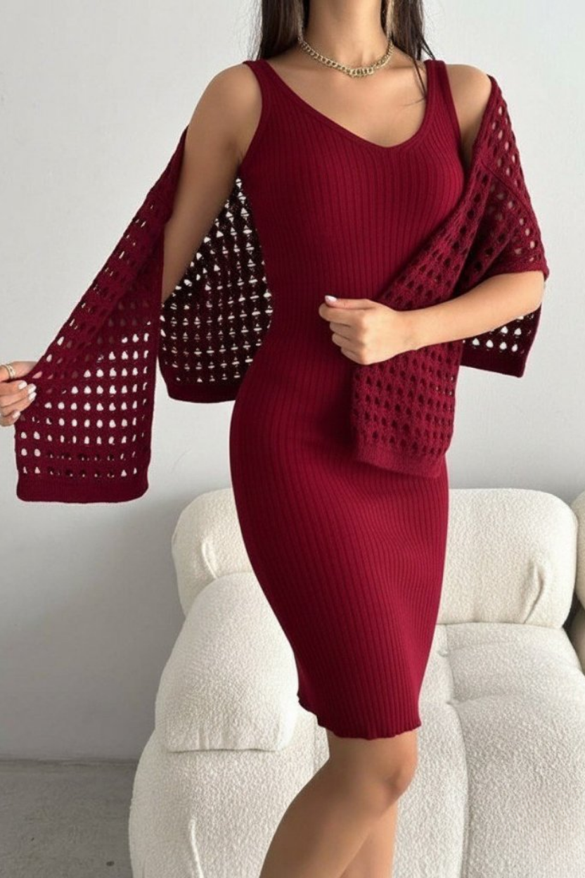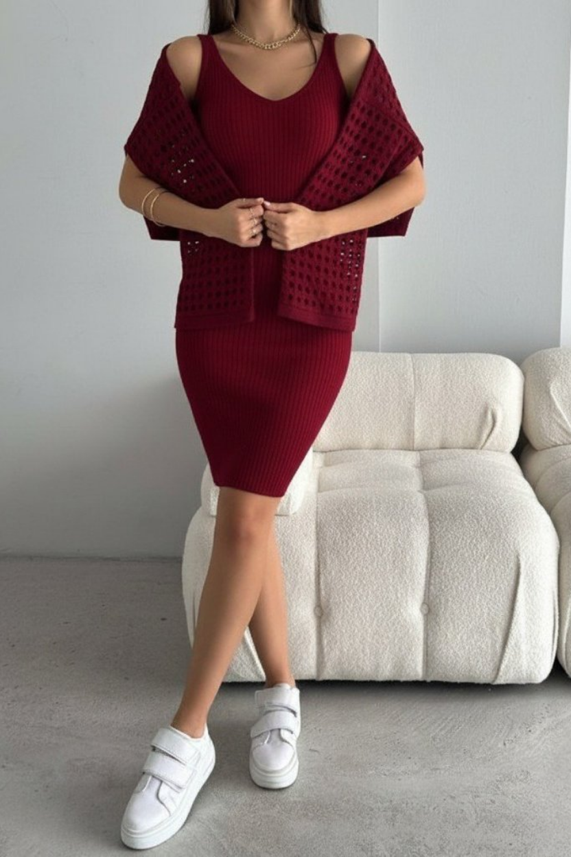 Kadın Delikli Kazak Askılı Elbise Triko Kumaş İkili Takım – Bordo