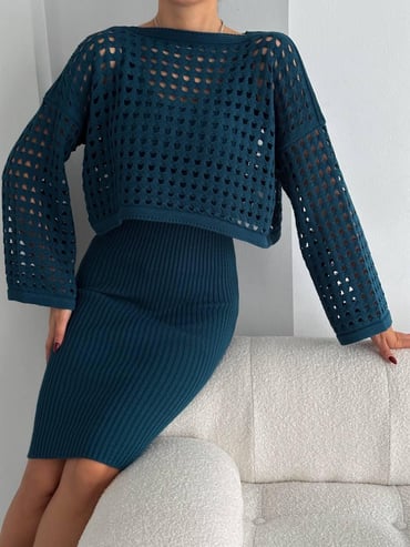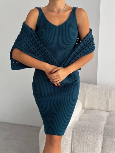 Şıklığı sade dokunuşlarla seven kadınlara özel tasarlanan bu petrol renk triko ikili takım, delikli örgü detaylı kazak ve askılı elbiseden oluşan şık ve pratik bir set sunar.