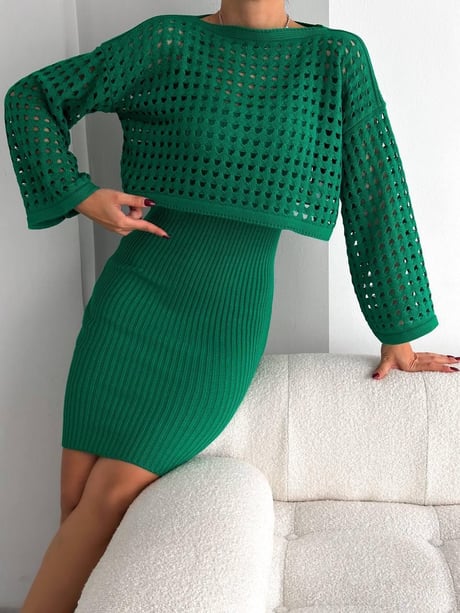 Kadın Delikli Kazak Askılı Elbise Triko Kumaş İkili Takım – Yeşil