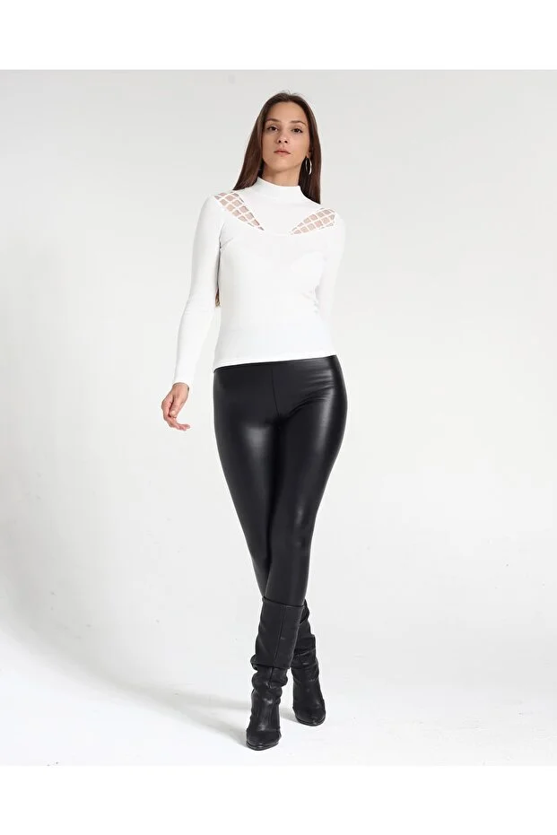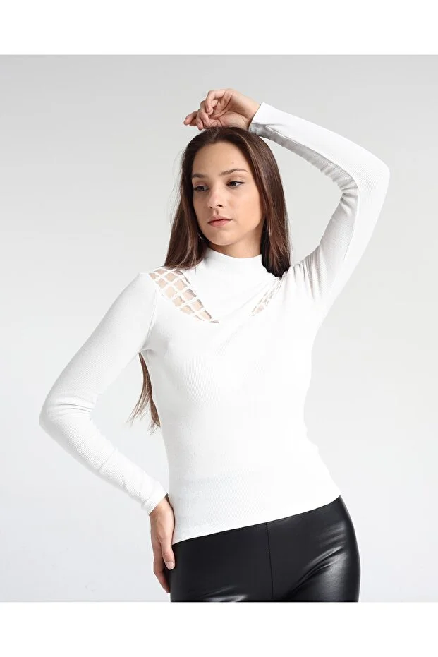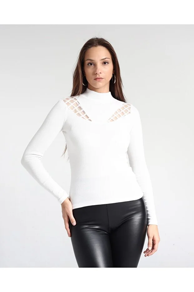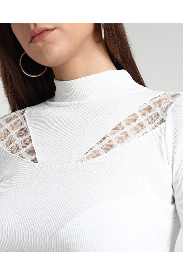 Bisiklet yaka kesimi ile modern ve sade bir stil oluştururken, dantel detayları ile feminen dokunuşlar ekler