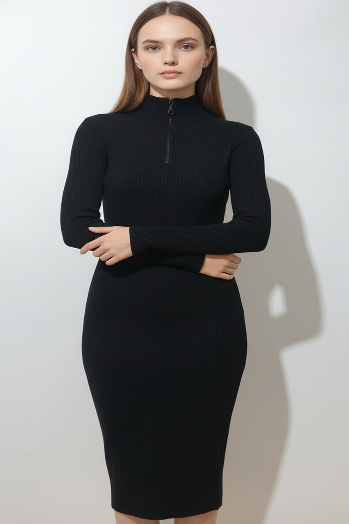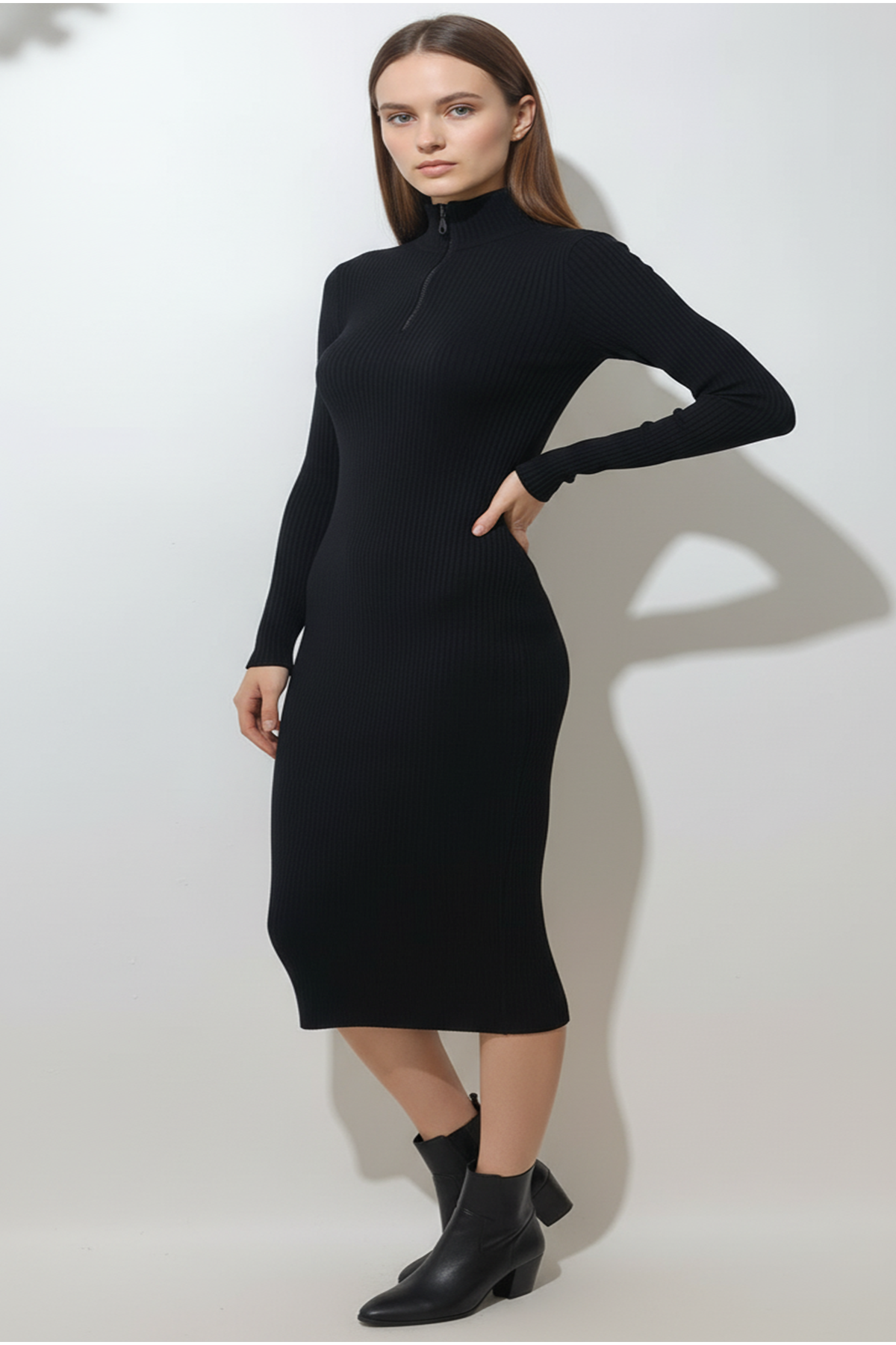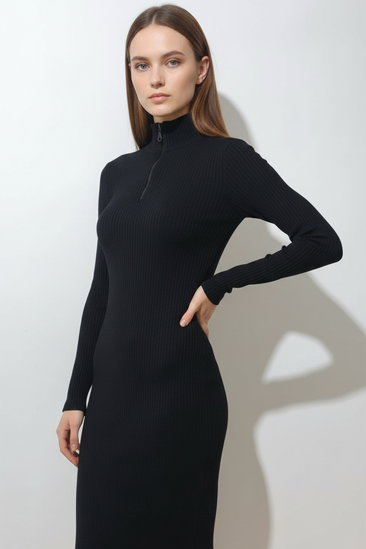 Kadın Fermuarlı Siyah Uzun Elbise, zarafeti ve modern tarzı bir araya getiren güçlü bir tasarıma sahip. Ön fermuar detayı, elbiseye hem şıklık hem de pratik bir kullanım kazandırırken, siyah rengin asaleti her ortamda etkileyici bir duruş sunar. Uzun kesimiyle zarif bir siluet oluşturur, konforlu kumaşıyla gün boyu rahatlık sağlar. Günlük kombinlerden özel davetlere kadar her anınıza uyum sağlayan bu elbise, stil sahibi kadınların vazgeçilmez tercihi olacak!