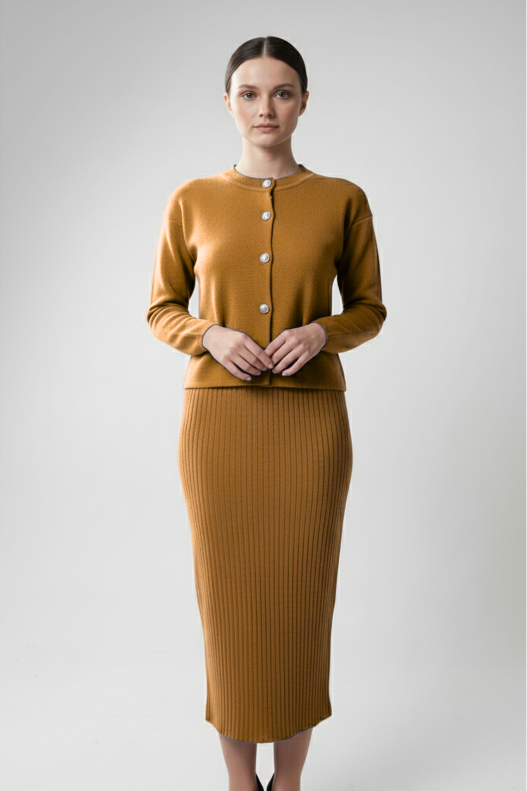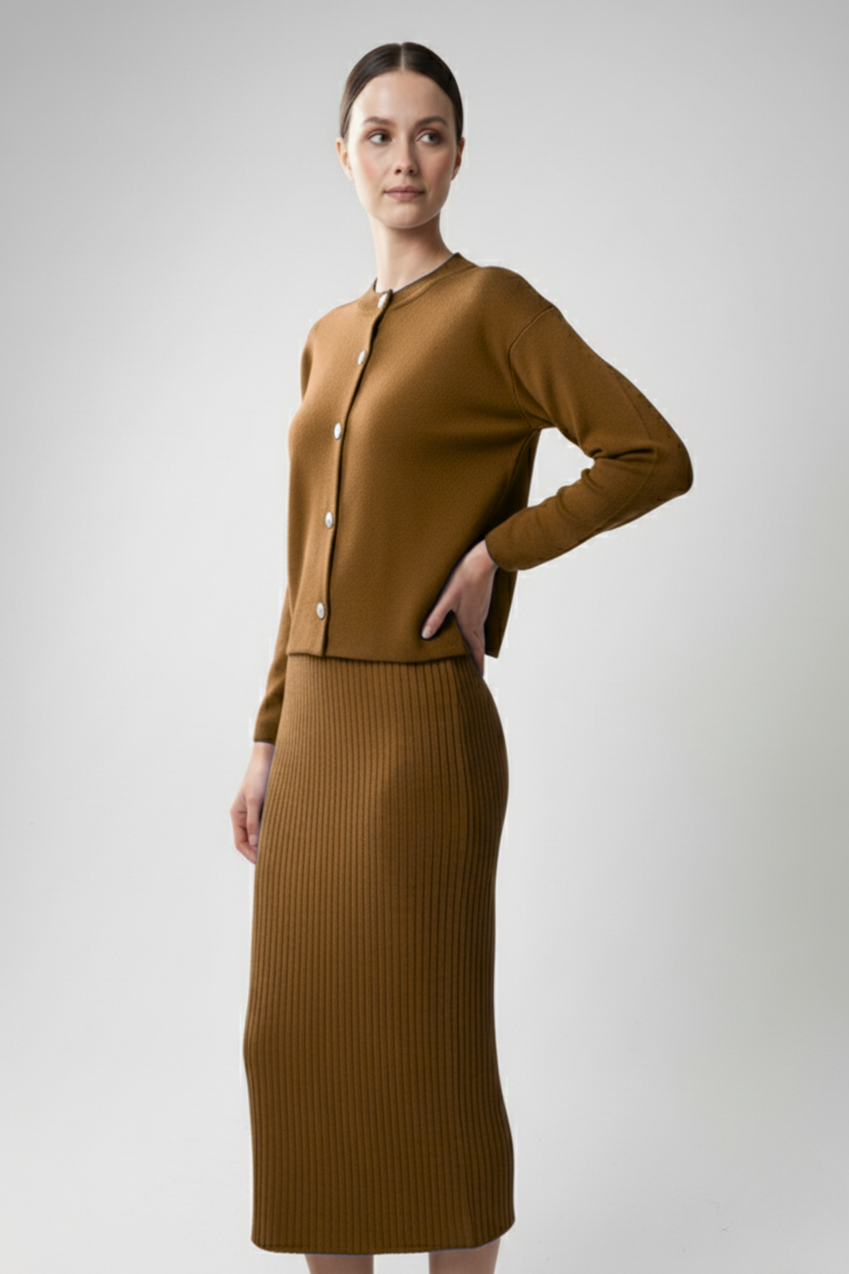 Kadın Hırka Elbise İkili Takım – Kahverengi, sıcak tonları ve zarif duruşuyla doğal şıklığın en zarif halini sunuyor. Kahverenginin toprak tonları, hem klasik hem de modern kombinlere uyum sağlarken, triko kumaşın yumuşak dokusu konforu ön plana çıkarır. Uzun hırka ve uyumlu elbise tasarımı, kusursuz bir bütünlük yaratarak zarif bir siluet oluşturur. Günlük kullanımdan özel buluşmalara kadar her ortamda sofistike bir görünüm isteyen kadınlar için mükemmel bir seçim!