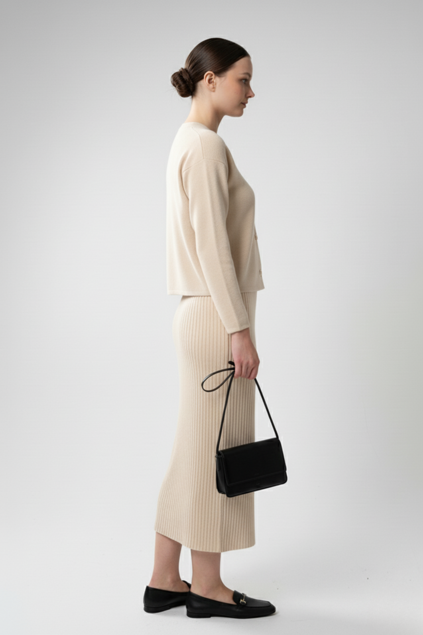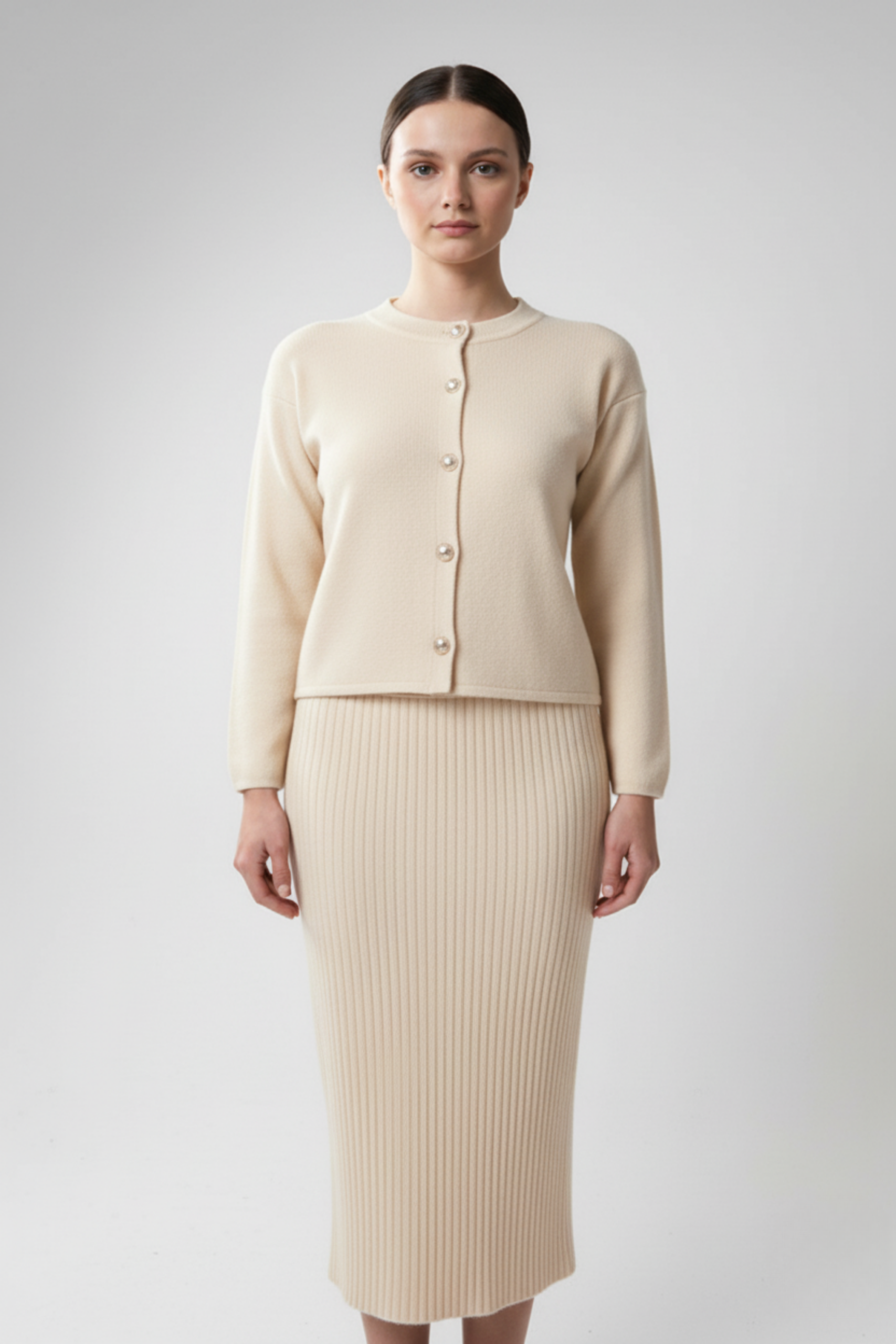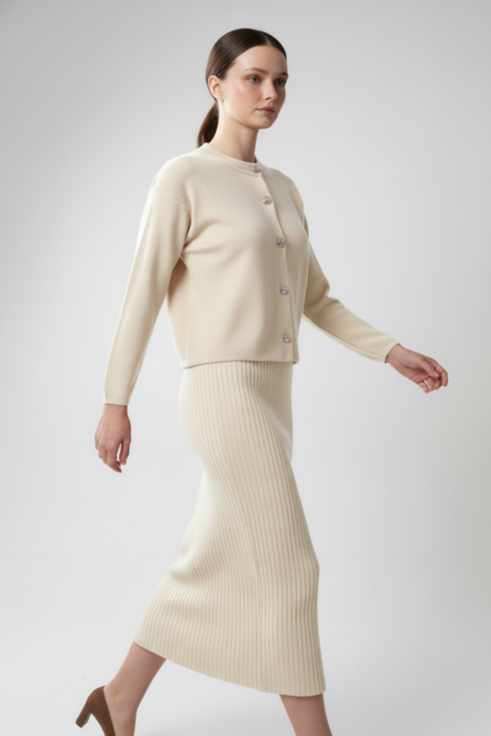 Kadın Hırka Elbise İkili Takım – Krem, sade zarafetiyle her dönemin favorisi olmaya aday! Krem rengin soft ve zarif tonları, doğal bir ışıltı kazandırırken, triko dokusu yumuşacık bir konfor sunar. Uzun hırka ve uyumlu elbise tasarımı, zarif bir bütünlük oluşturarak hem günlük hem de özel anlarda kusursuz bir görünüm sağlar. Minimal çizgileriyle öne çıkan bu takım, sade ama etkileyici şıklığın en güzel hali!