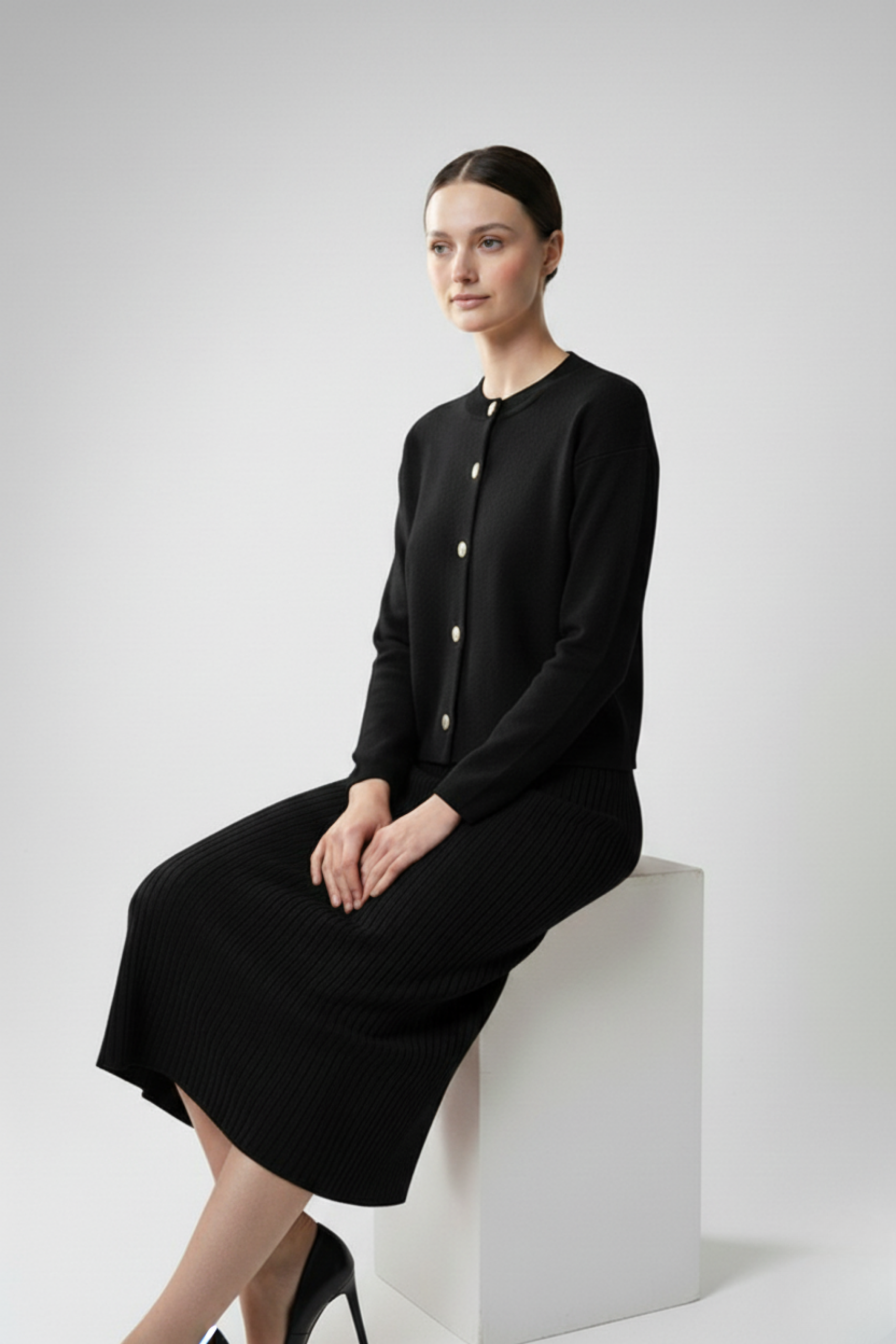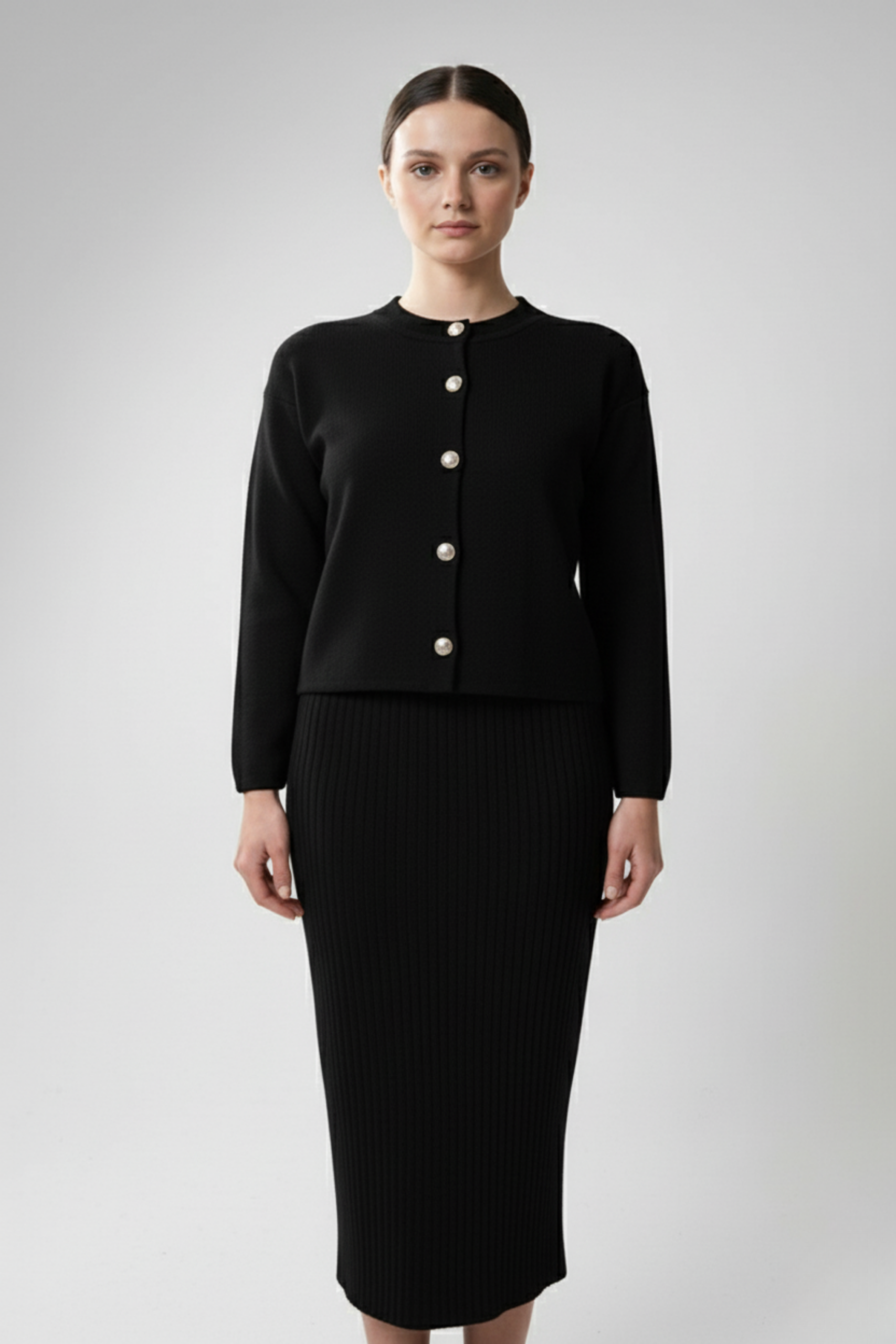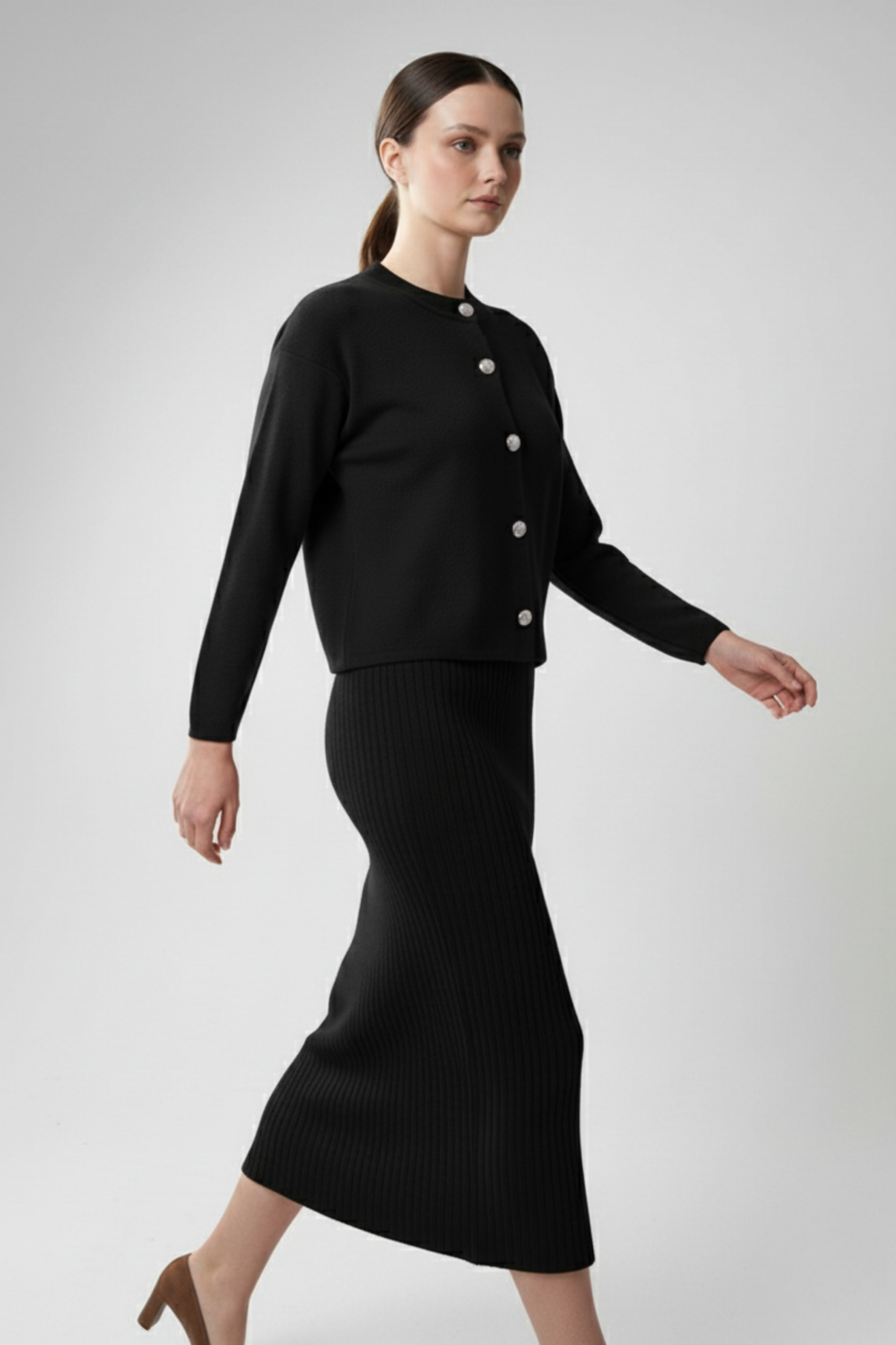 Kadın Hırka Elbise İkili Takım – Siyah, sade zarafetin en etkileyici halini yansıtıyor. Siyah rengin asil ve zamansız duruşu, bu takımı hem klasik hem de modern bir görünüme kavuşturuyor. Triko kumaşın yumuşak dokusu, konforlu bir kullanım sunarken, uzun hırka ve uyumlu elbise kombinasyonu şıklığı zahmetsizce tamamlıyor. Günlük hayatta, ofiste ya da özel davetlerde her zaman şık görünmek isteyen kadınlar için mükemmel bir seçim!