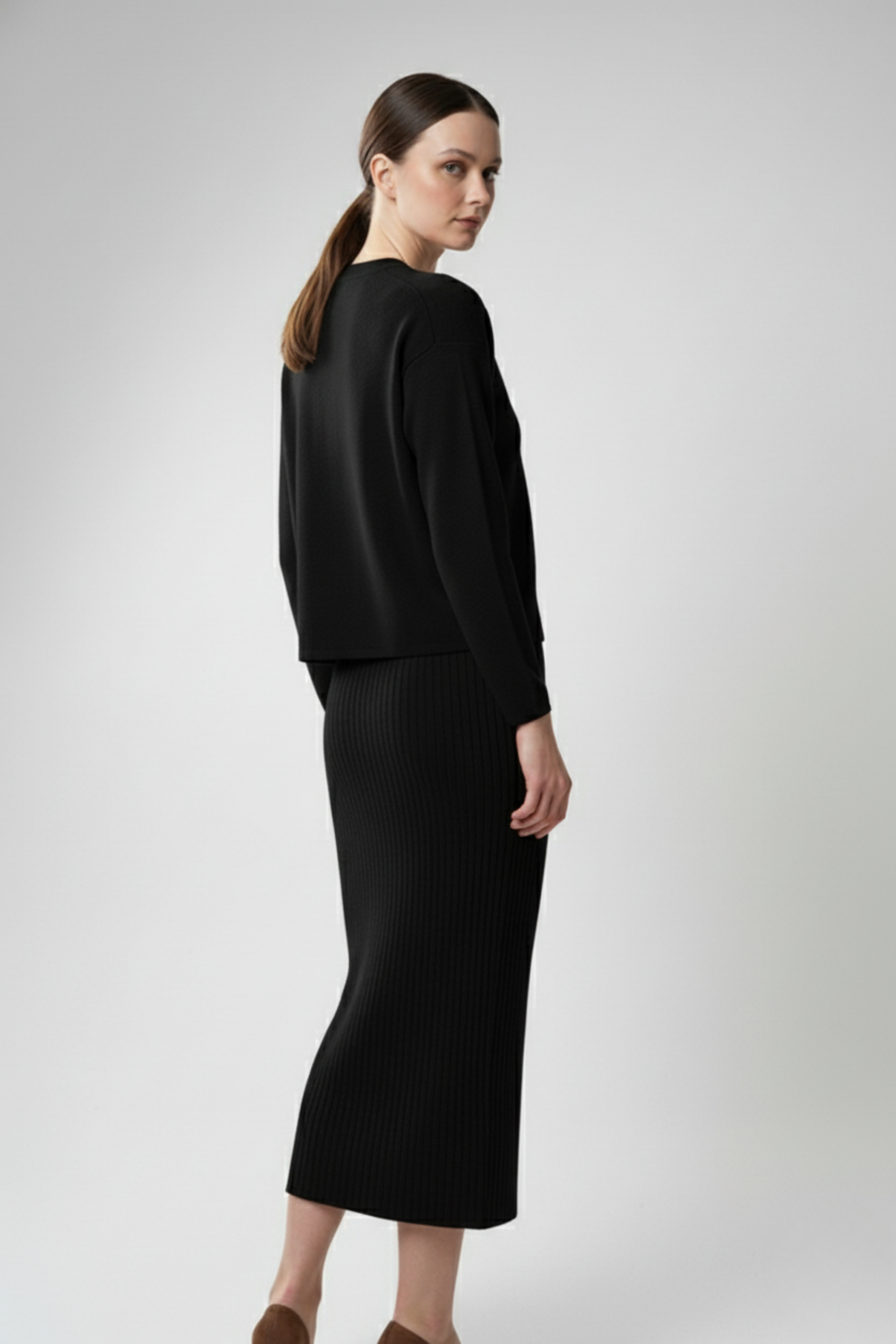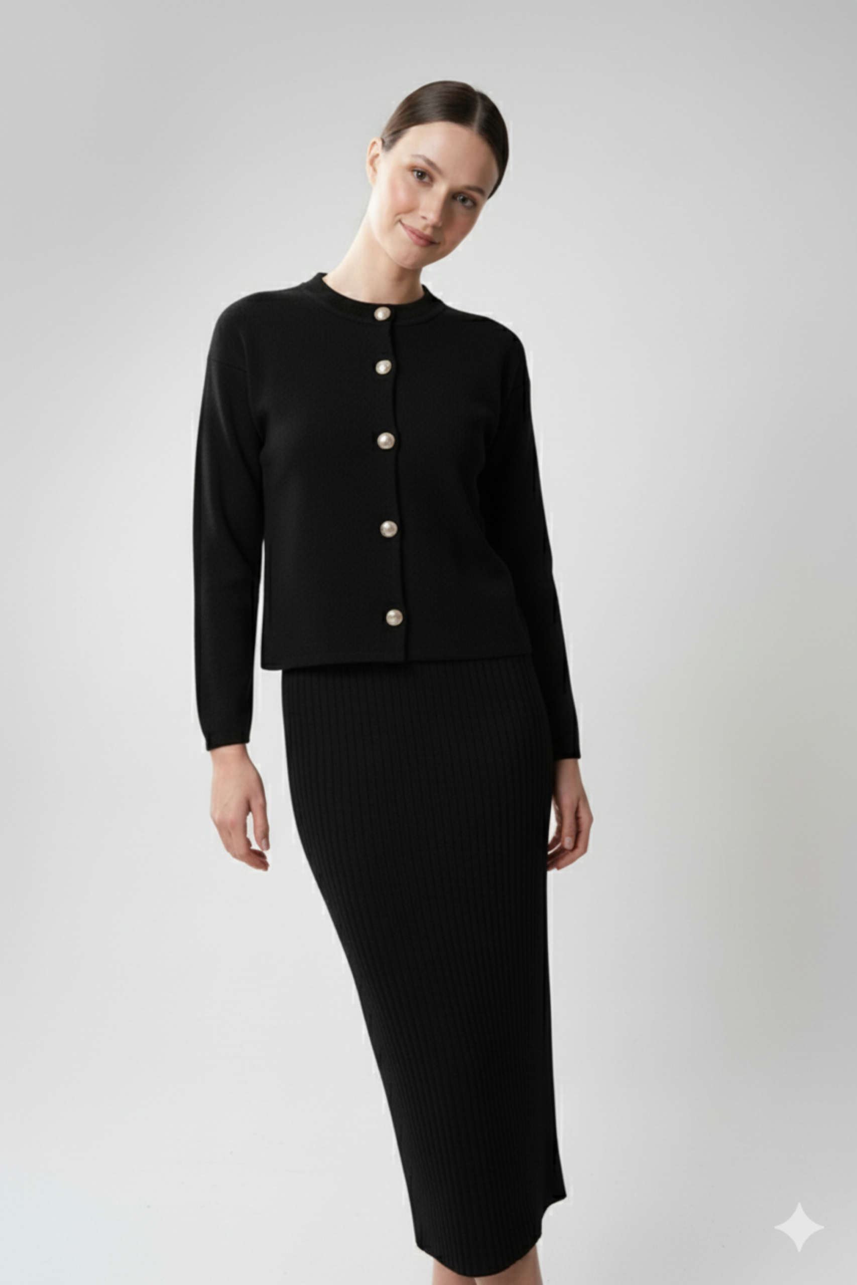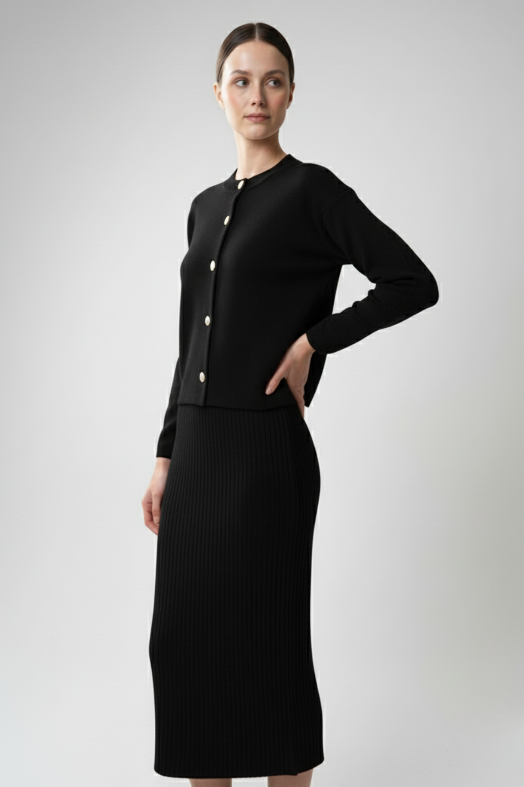 Kadın Hırka Elbise İkili Takım – Siyah, sade zarafetin en etkileyici halini yansıtıyor. Siyah rengin asil ve zamansız duruşu, bu takımı hem klasik hem de modern bir görünüme kavuşturuyor. Triko kumaşın yumuşak dokusu, konforlu bir kullanım sunarken, uzun hırka ve uyumlu elbise kombinasyonu şıklığı zahmetsizce tamamlıyor. Günlük hayatta, ofiste ya da özel davetlerde her zaman şık görünmek isteyen kadınlar için mükemmel bir seçim!