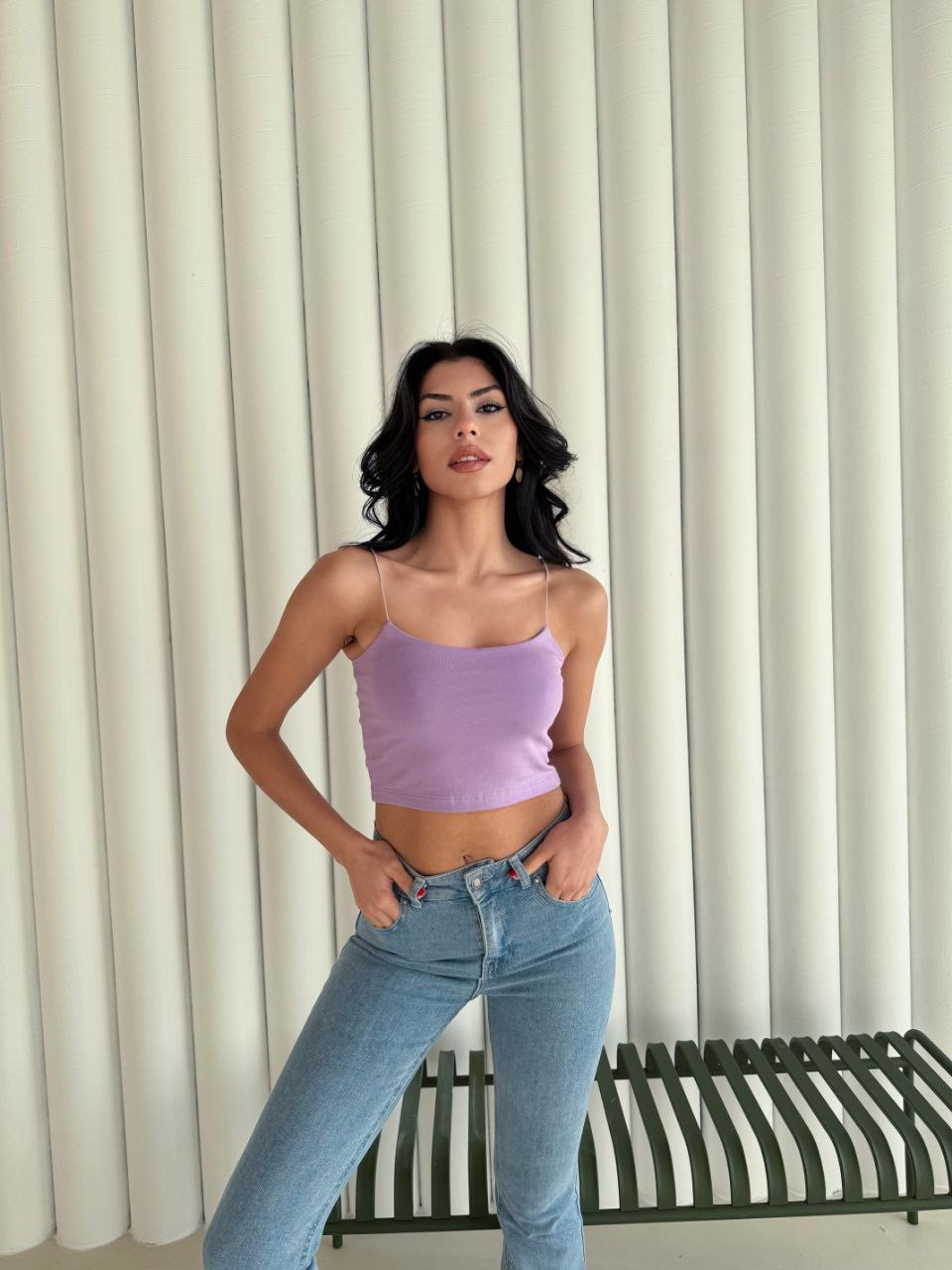 İnce ip askılarıyla zarif bir görünüm kazandıran bu kısa crop modeli, morun enerjik tonuyla kombinlerine canlılık katar. Günlük hayatta kot pantolon, etek ya da şortlarla kolayca eşleştirebilir, sade bir şıklıkla fark yaratabilirsin.