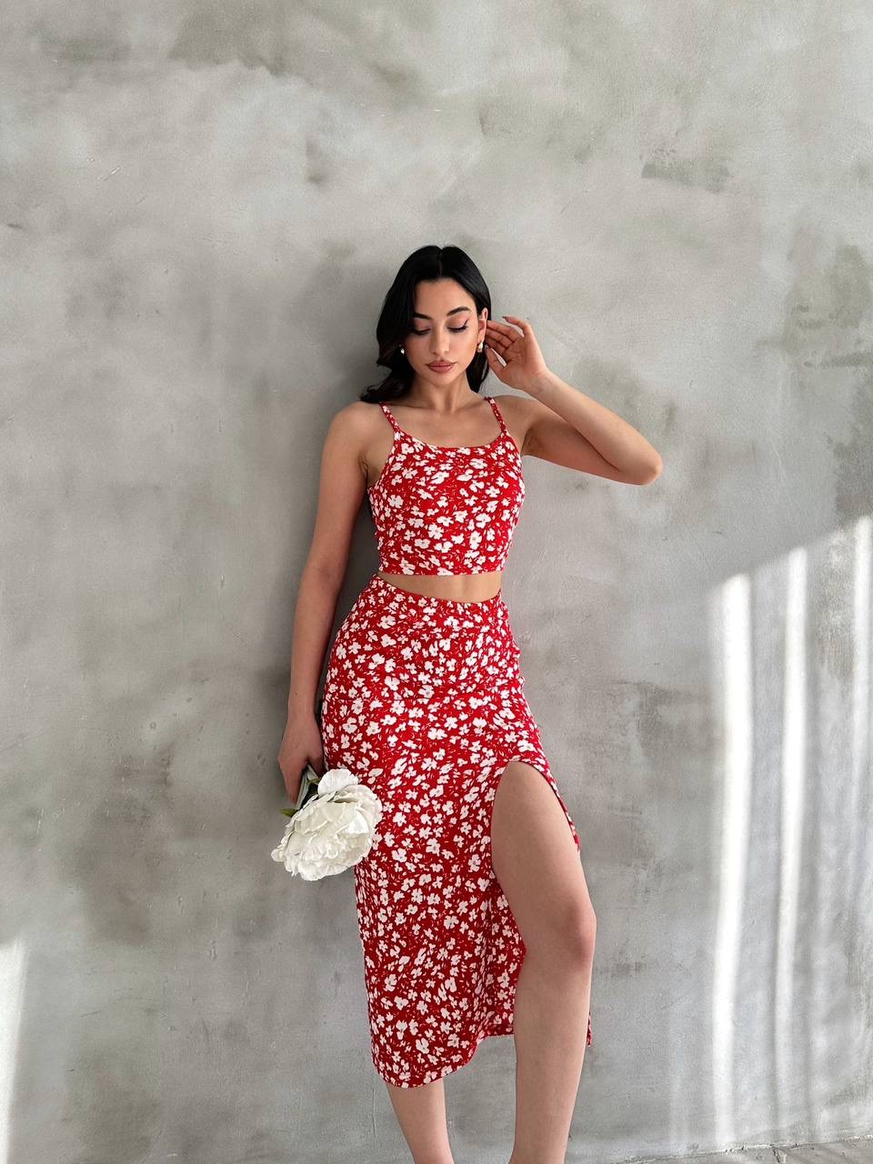 Canlı kırmızı zemin üzerine beyaz çiçek desenleriyle tasarlanan bu ikili takım, enerjik ve çekici bir görünüm sunar. Askılı crop bluz ve yırtmaç detaylı etek kombinasyonu, feminen çizgilerle rahatlığı bir arada sunar. Esnek kumaşı sayesinde gün boyu konforlu hareket imkanı sağlar. Günlük kullanımdan özel davetlere kadar her ortamda tarzınızı ön plana çıkarır.