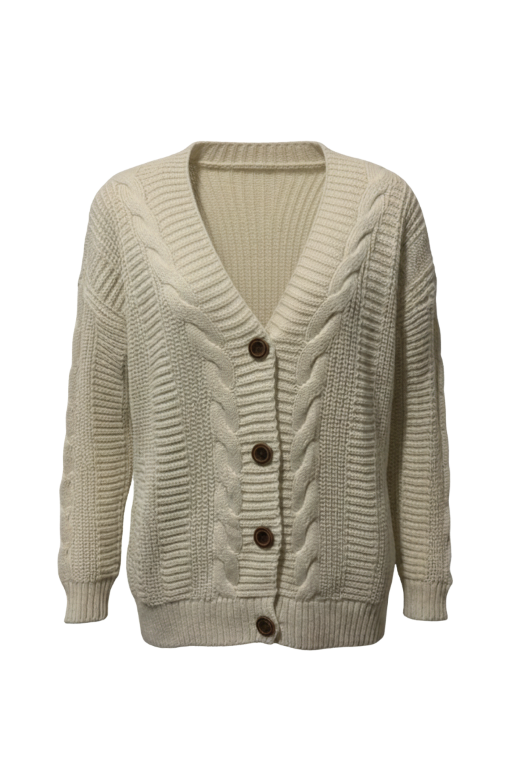 Kadın Krem Düğmeli Kısa Triko Hırka – Burgulu Örgü Desenli