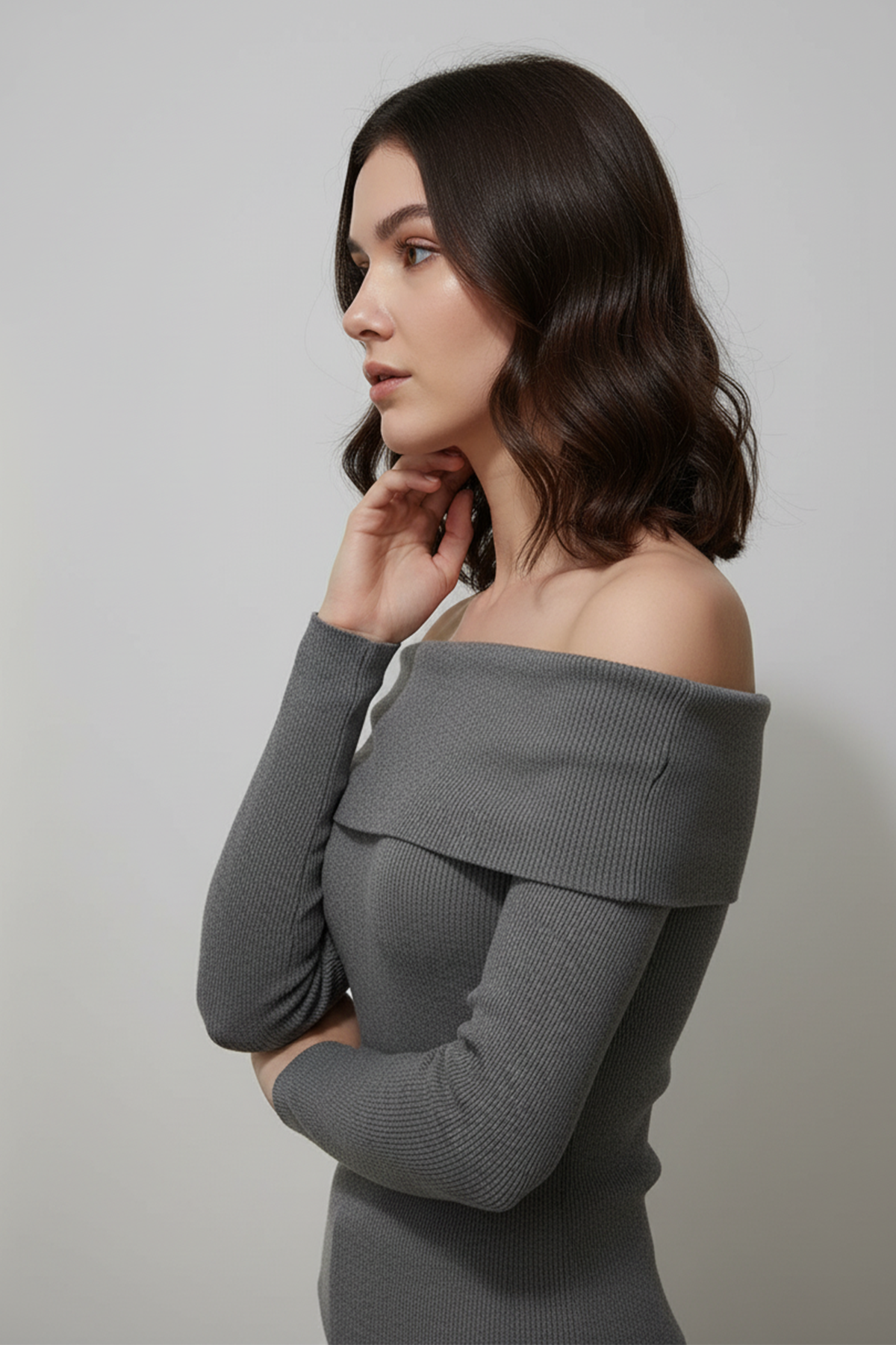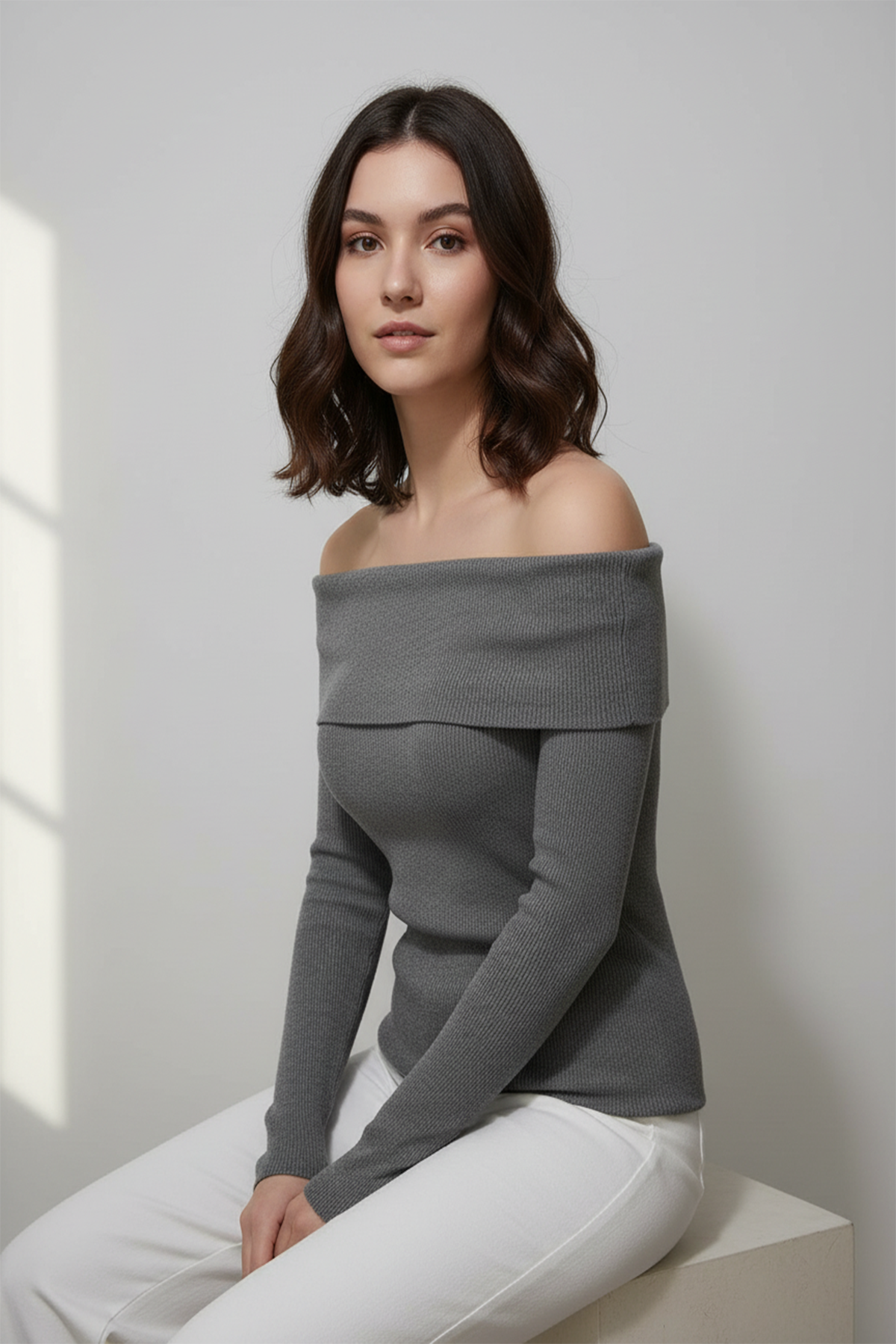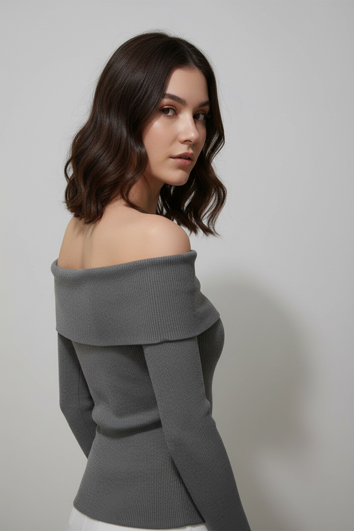 Kadın Madonna Yaka Şardonlu Gri Bluz