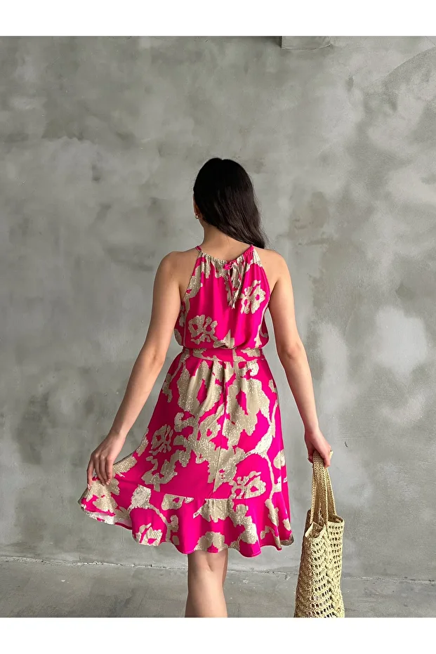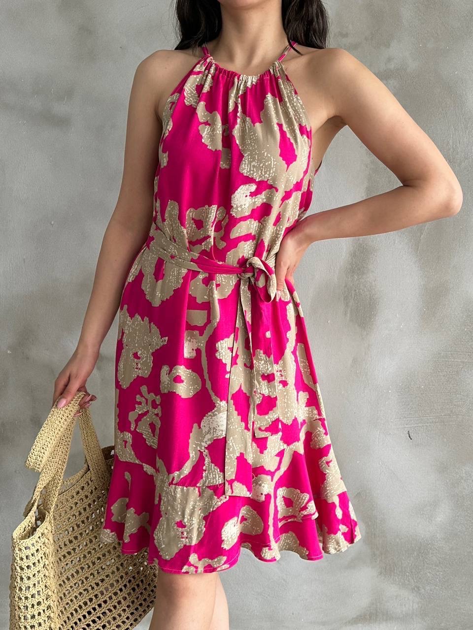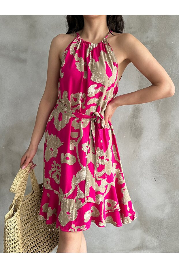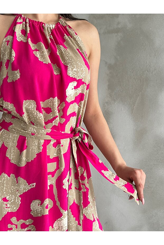 Kadın Pembe Bej Desenli Halter Yaka Kuşaklı Yazlık Elbise