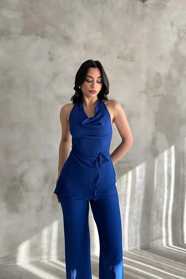 Canlı saks mavisi rengiyle enerjik ve zarif bir görünüm sunan bu ikili takım, tarzını ön plana çıkarmak isteyen kadınlar için ideal bir seçimdir. Degaje yaka bluzun dökümlü formu feminen bir dokunuş kazandırırken, lastikli bel pantolon gün boyu konfor sağlar. Akıcı kumaşı ve modern kesimiyle hem rahat hem de şık bir duruş elde edebilirsiniz. Günlük kombinlerden özel davetlere kadar her ortamda dikkat çekici bir görünüm oluşturur.