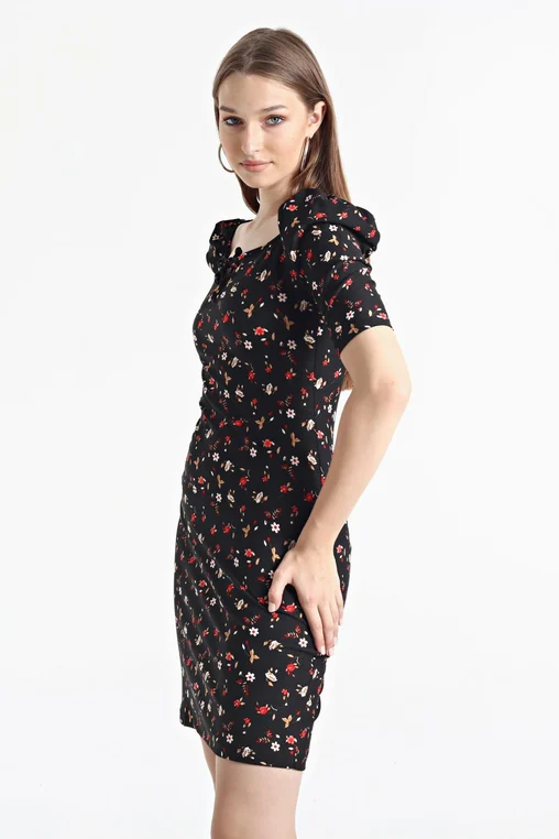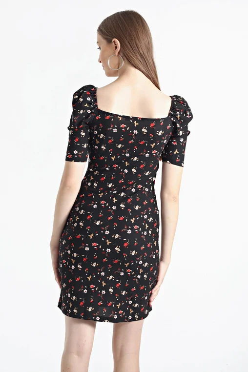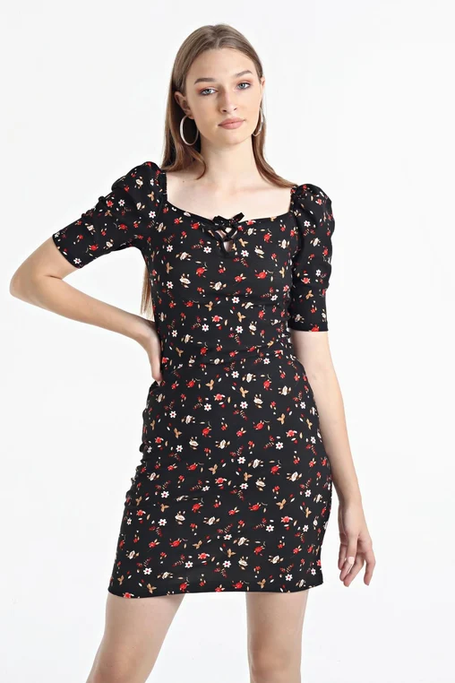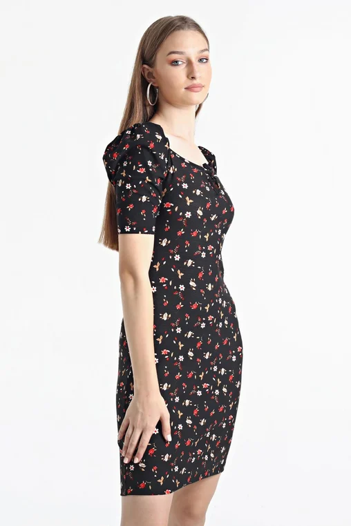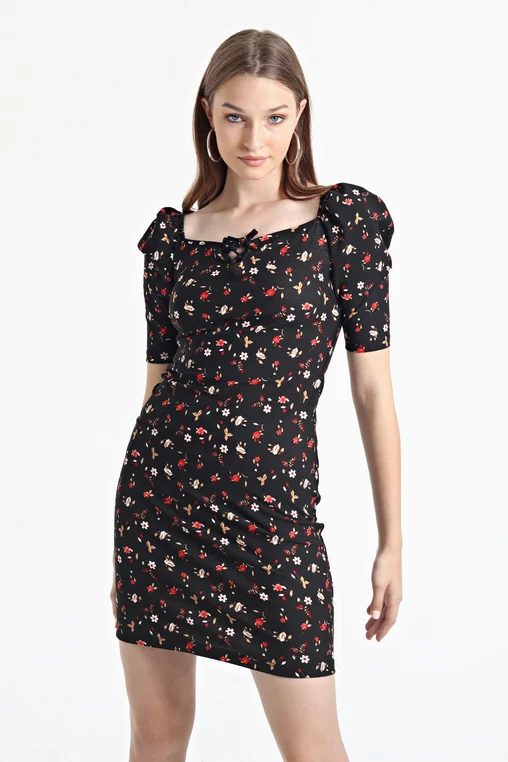 Kadın Siyah Balon Kol Kare Yaka Elbise