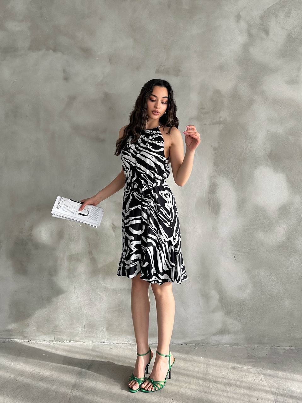 – Yaz aylarının vazgeçilmezi, hafif ve rahat dokusuyla dikkat çeken desenli halter yaka elbise.