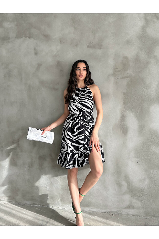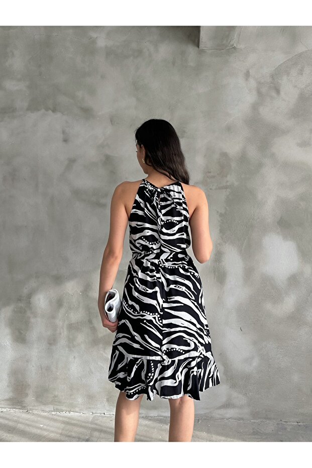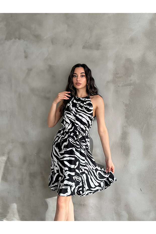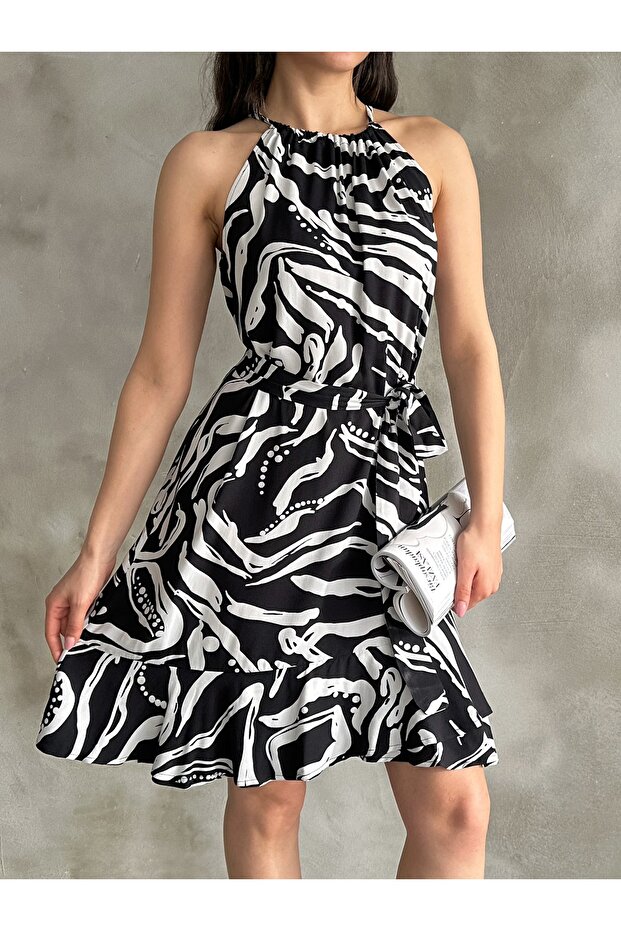 Kadın Siyah Beyaz Desenli Halter Yaka Kuşaklı Yazlık Elbise