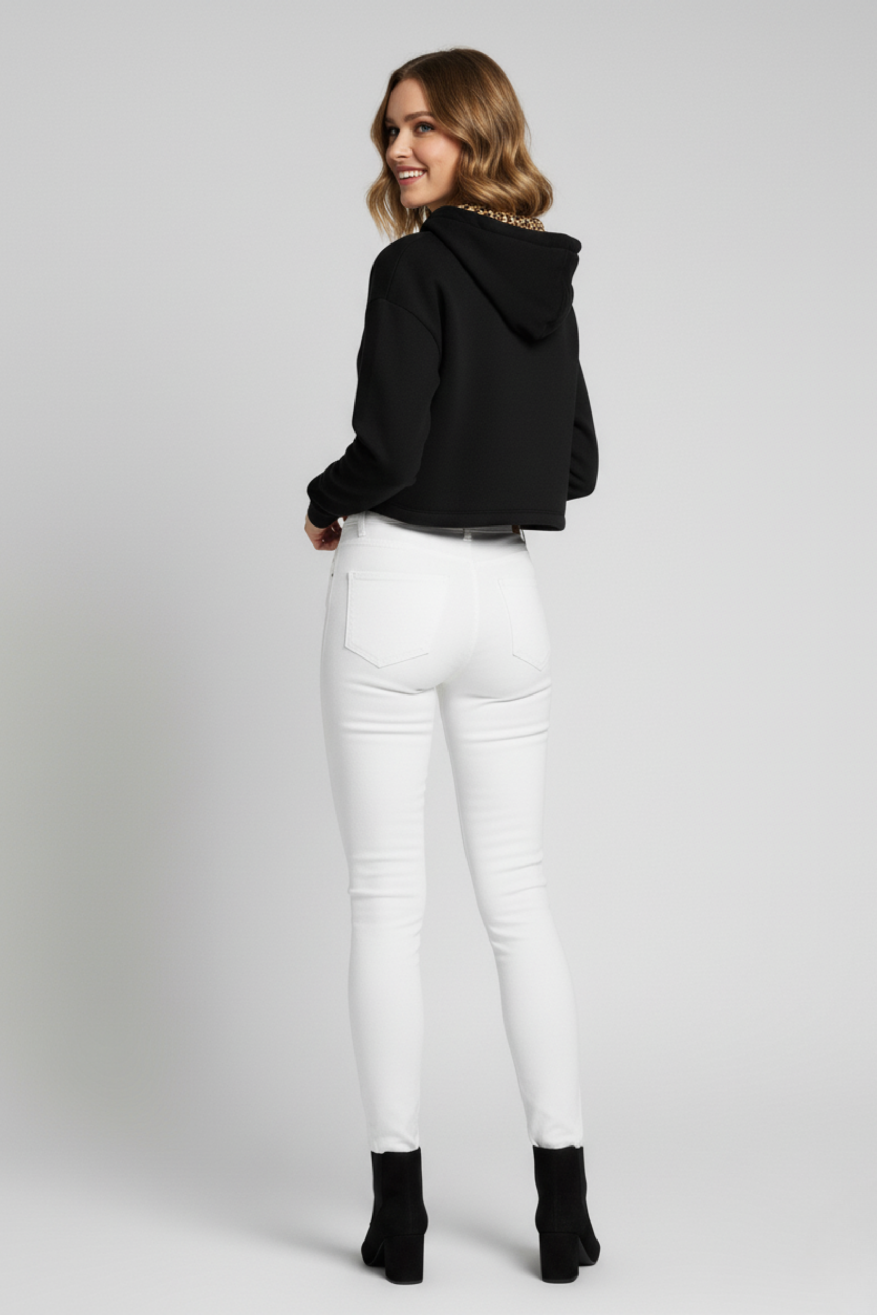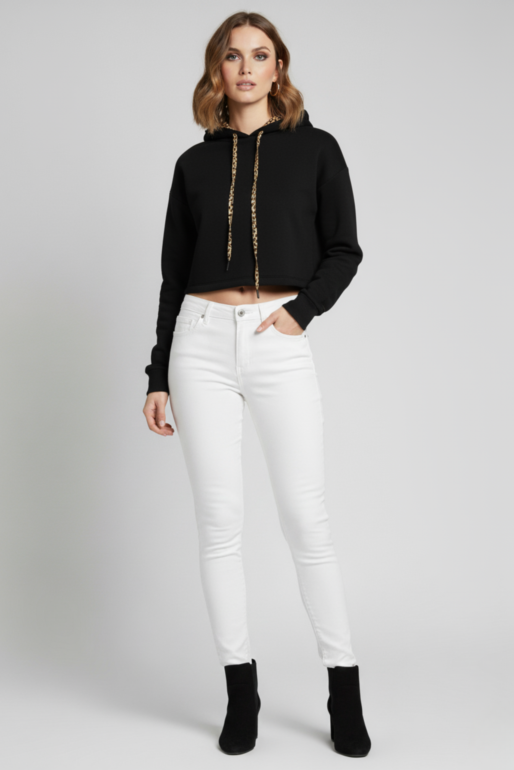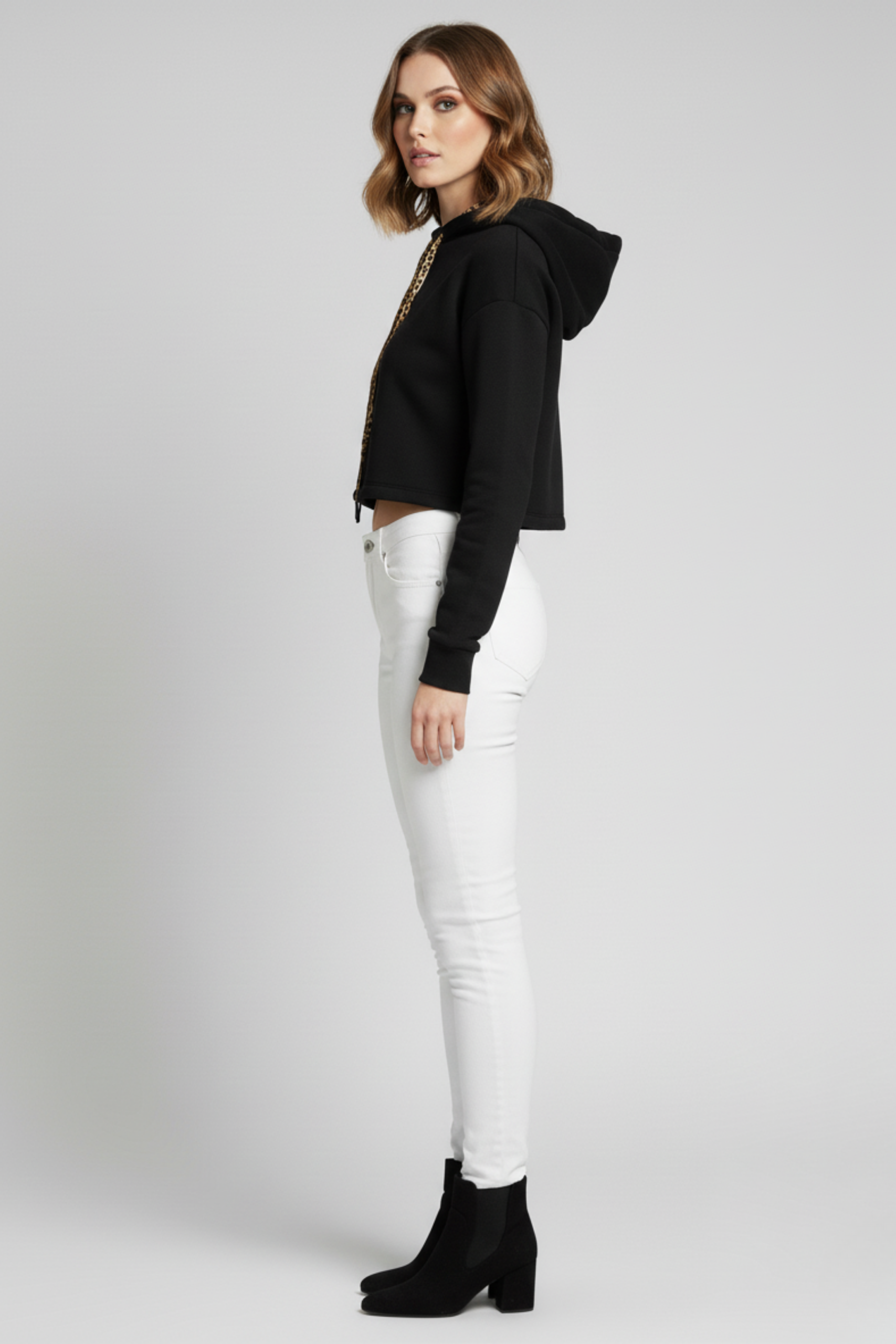 Kadın Siyah Kapüşon İçi Desenli Astar Etek Ucu Yırtmaçlı Crop